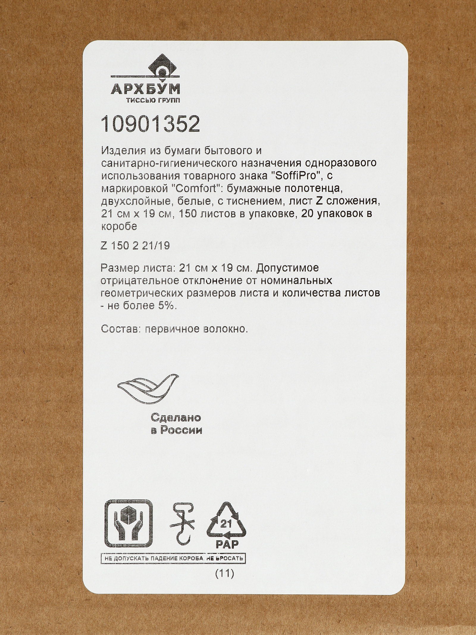Бумажные полотенца Z-сложения Comfort 21x19, двухслойные,150 шт., SoffiPro, Россия