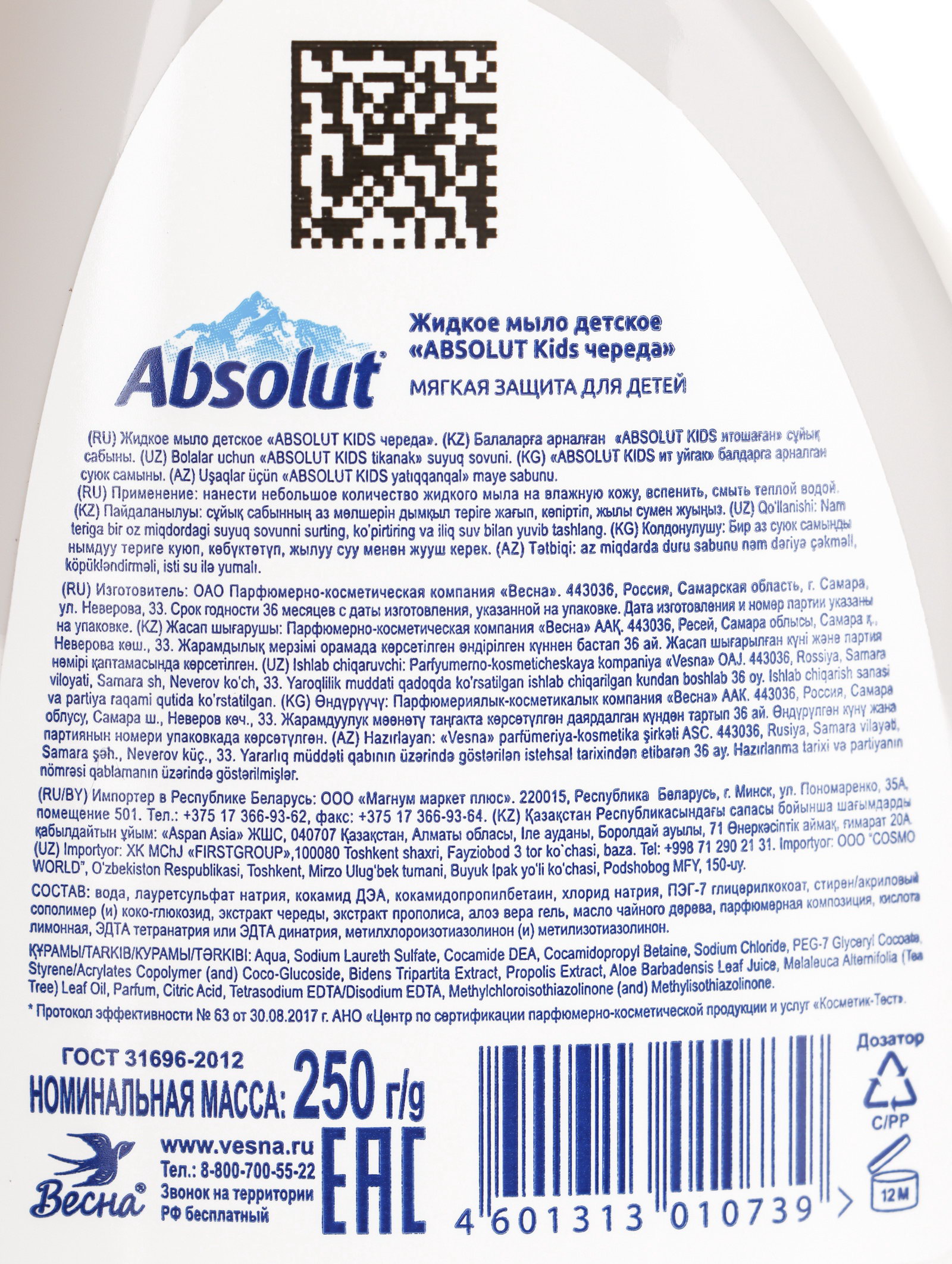 Мыло жидкое детское Kids "Череда", 250 мл, 8x16x4.5 см., Absolut, Россия