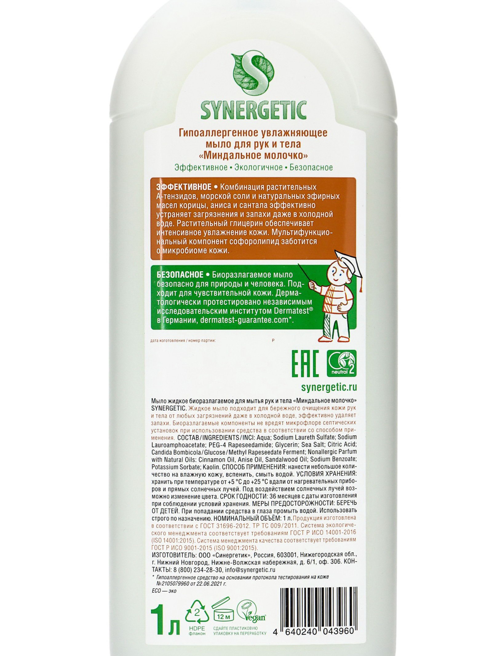 Жидкое мыло "Миндальное молочко", 1 л, Synergetic, Россия