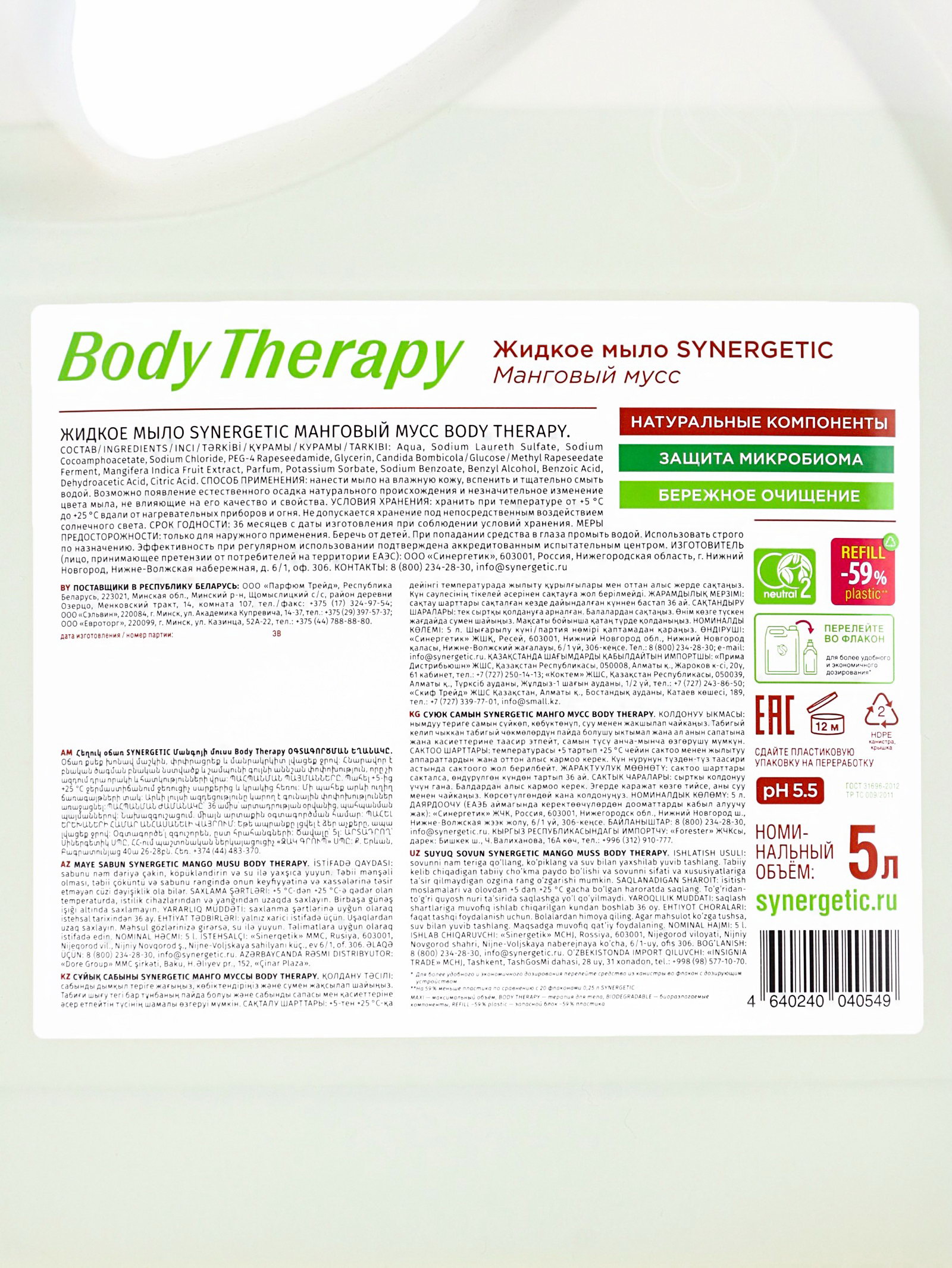 Жидкое мыло Body Therapy "Манговый мусс", 5 л, Synergetic, Россия