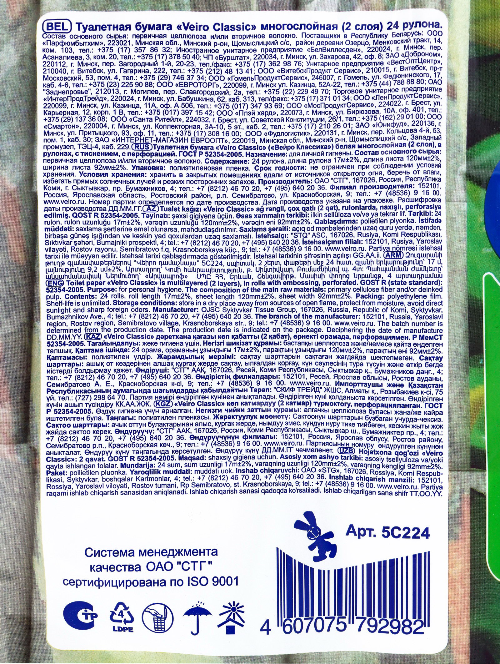 Туалетная бумага Linia Classic, белая, 2 слойная, 24 шт., 37x20x27 см., VEIRO, Россия
