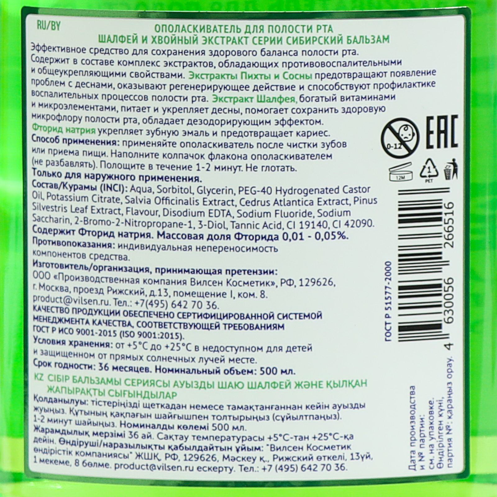 Ополаскиватель для полости рта "Шалфей и Хвойный экстракт" серии "Сибирский бальзам", 500 мл, 500 мл., Vilsen, Россия