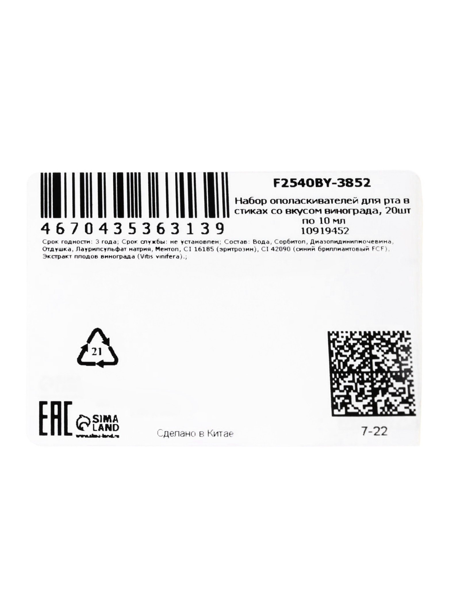 Размер упаковки: 8.5 x 5 x 13 см. tnved: 3306100000 Возраст: Для взрослых Набор ополаскивателей для рта в индивидуальных стиках со вкусом винограда это удобное и практичное решение для поддержания свежести дыхания в течение дня. Формат одноразовых порций идеально подходит для активного образа жизни и позволяет легко заботиться о гигиене полости рта в любой ситуации. Каждый стик содержит 10 мл готового к применению средства оптимальный объём для одного полноценного полоскания. Индивидуальная упаковка обеспечивает максимальную гигиеничность и исключает необходимость дозирования. Компактные стики удобно брать с собой на работу, в поездку, в спортзал или держать в автомобиле и сумке. Освежающий вкус винограда мягко очищает полость рта, помогает нейтрализовать неприятный запах и дарит приятное фруктовое послевкусие. Ополаскиватель не вызывает ощущения жжения, подходит для ежедневного применения и станет отличным дополнением к привычной чистке зубов. Средство особенно удобно использовать после еды, кофе или других напитков, когда нет возможности воспользоваться зубной щёткой. Ополаскиватель не требует разведения водой и полностью готов к использованию сразу после вскрытия стика, что делает его максимально удобным вне дома. Способ применения