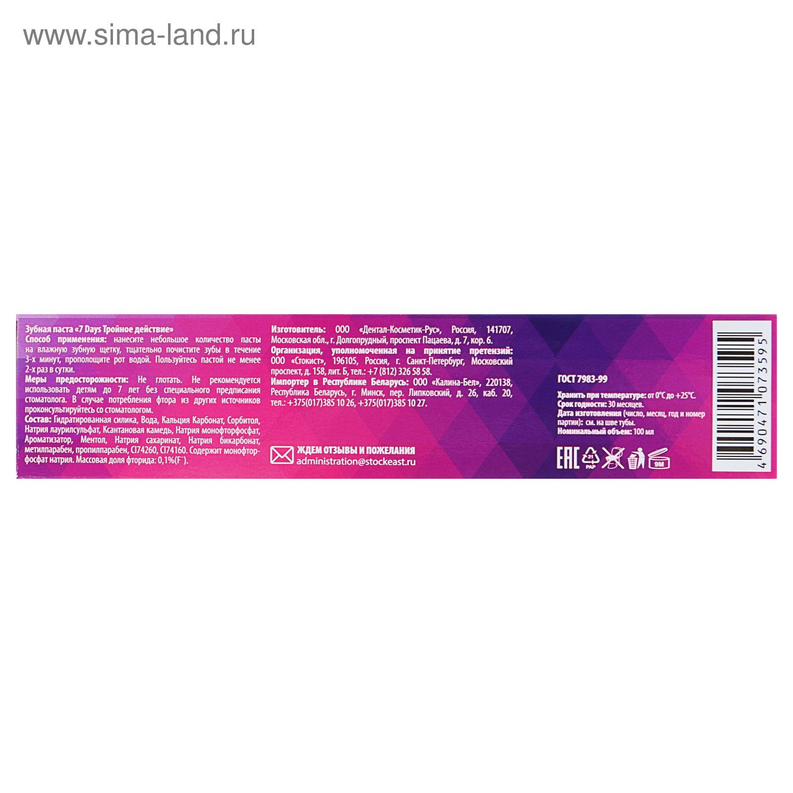 Зубная паста комплексная "Тройное действие", 100 мл, 7 days, Россия
