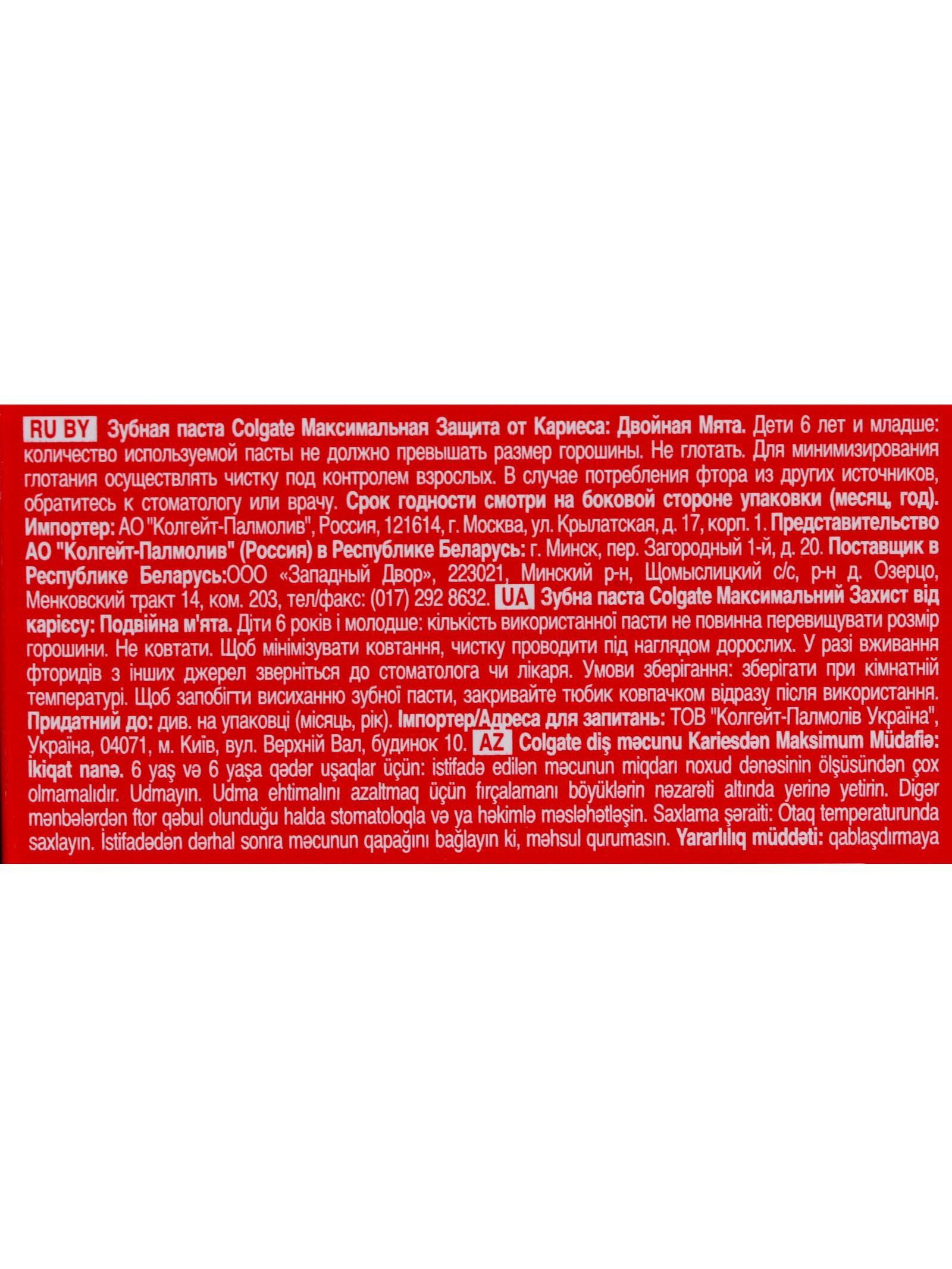 Зубная паста "Максимальная защита от кариеса", двойная мята, 100 г, 19x4x5 см., Colgate, Китай