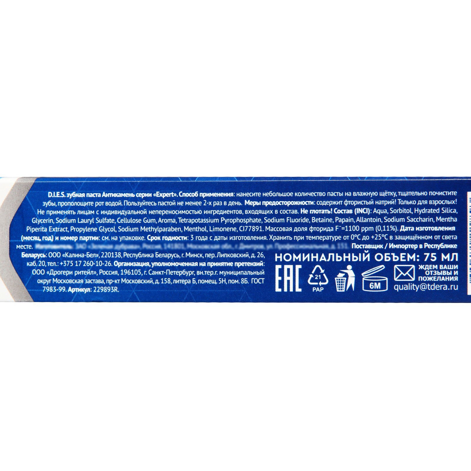 Размер упаковки: 3.3 x 19 x 4 см. Размер упаковки: 3.3 x 19 x 4 см. Температурное ограничение: Нет Применение: Защита от кариеса Особенности состава: С фтором Вес/Объём: 75 мл Возраст: Взрослый С дозатором: Нет tnved: 3306100000 Зубная паста D.I.E.S. "Антикамень" - это эффективное средство для ухода за полостью рта. Упакована в тубу объемом 75 мл Зубная паста содержит комплекс активных компонентов, которые помогают бороться с зубным налетом, кариесом, предотвращает появление зубного камня и другими проблемами полости рта. Она также способствует укреплению зубной эмали и десен. Паста имеет приятный вкус и аромат. Легко наносится на зубную щетку и хорошо пенится. | ||
