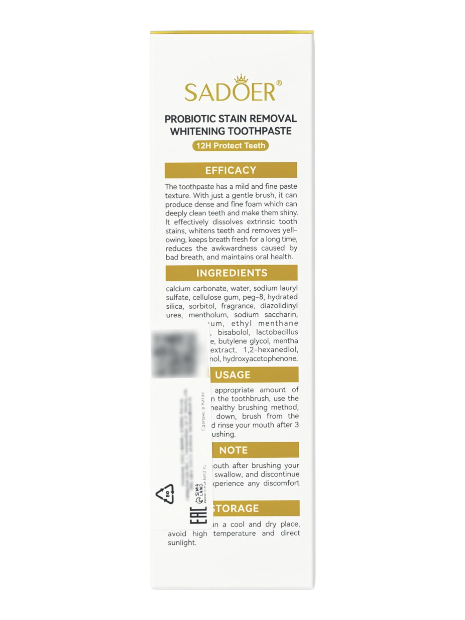 Зубная паста с пробиотиками, 100 г, SADOER, Китай