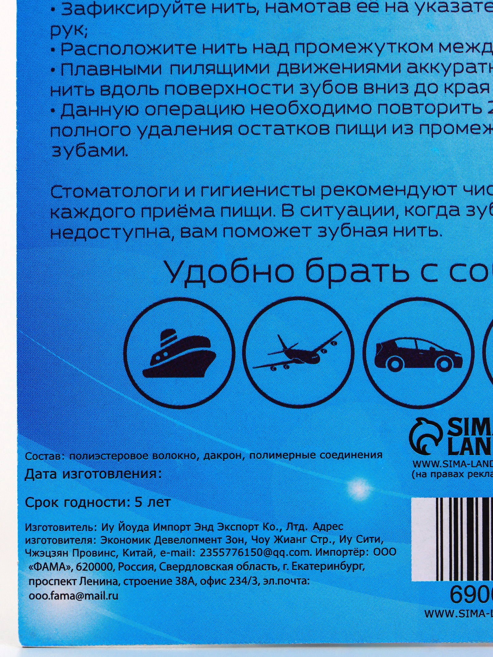 Размер упаковки: 7 x 2 x 11 см. Размер упаковки: 7 x 2 x 11 см. tnved: 3306200000 Длина, м: 50 Описание: самое лёгкое, удобное и эффективное средство для гигиены полости рта. Зубная нить легко проникает в труднодоступные места между зубами, удаляет остатки пищи и зубной налёт. Использование зубной нити после каждого приёма пищи предотвращает образование кариеса, снижает риск возникновения заболеваний дёсен и появление неприятного запаха изо рта. Способ применения: с помощью ножика на гигиеничном боксе отрежьте 30-45 см нити. Зафиксируйте нить, намотав её на указательные пальцы рук. Расположите нить над промежутком между зубами.Плавными, пилящими движениями аккуратно перемещайте нить вдоль поверхности зубов вниз до края десны и обратно.Данную операцию необходимо повторять 2-3 раза или до полного удаления остатков пищи между зубами. Состав: полиэстеровое волокно, дакрон, полимерные соединения. В ситуации, когда нет под рукой зубной щётки, используйте зубную нить. | ||