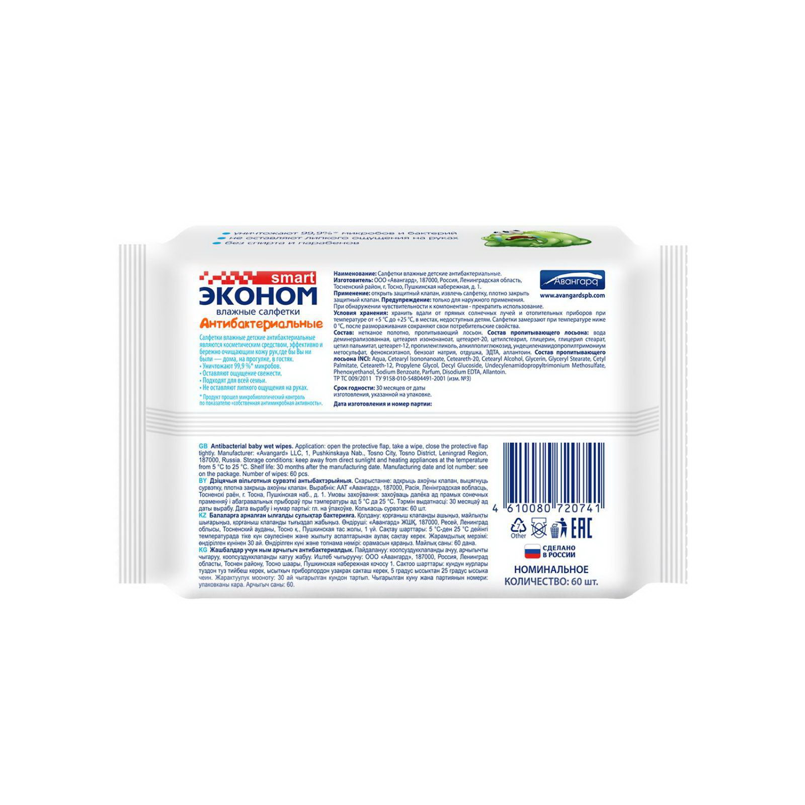 Влажные салфетки детские антибактериальные, 60 шт., Эконом Smart, Россия