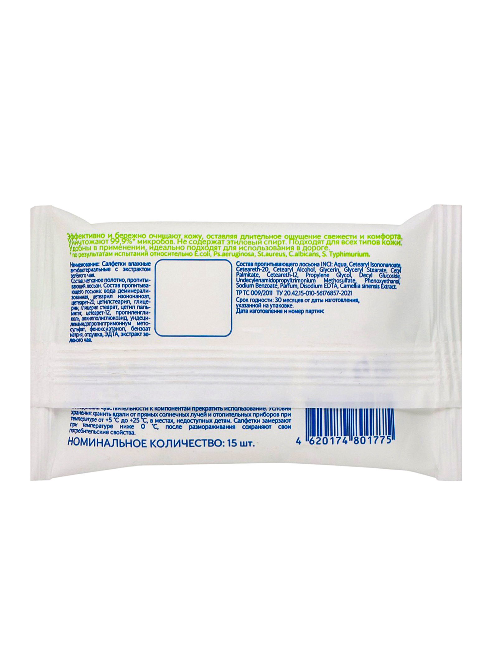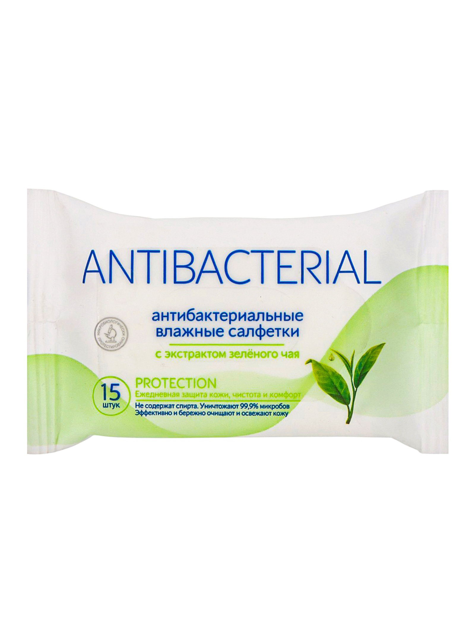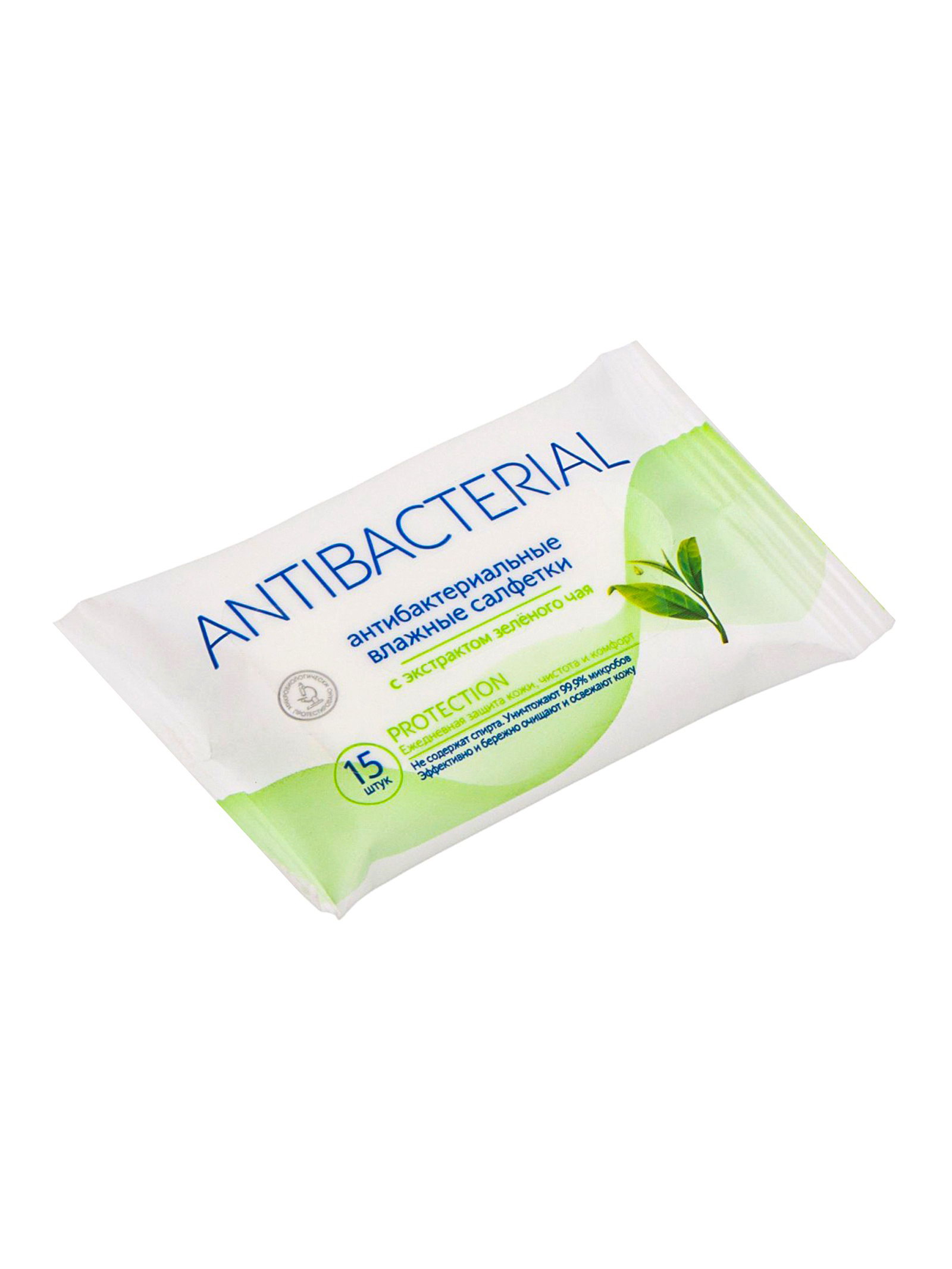 Влажные салфетки антибактериальные, с экстрактом зелёного чая, 15 шт., Россия