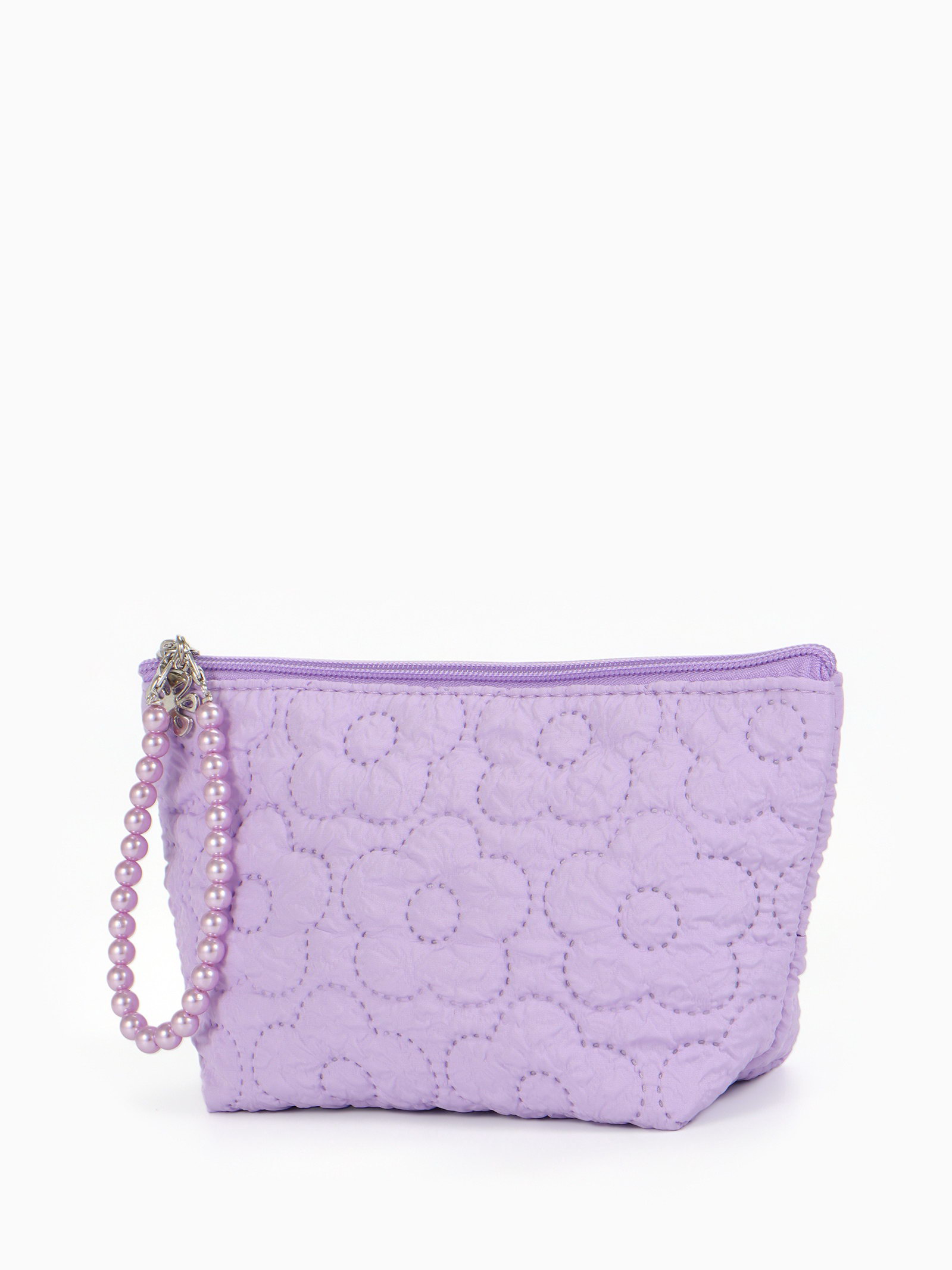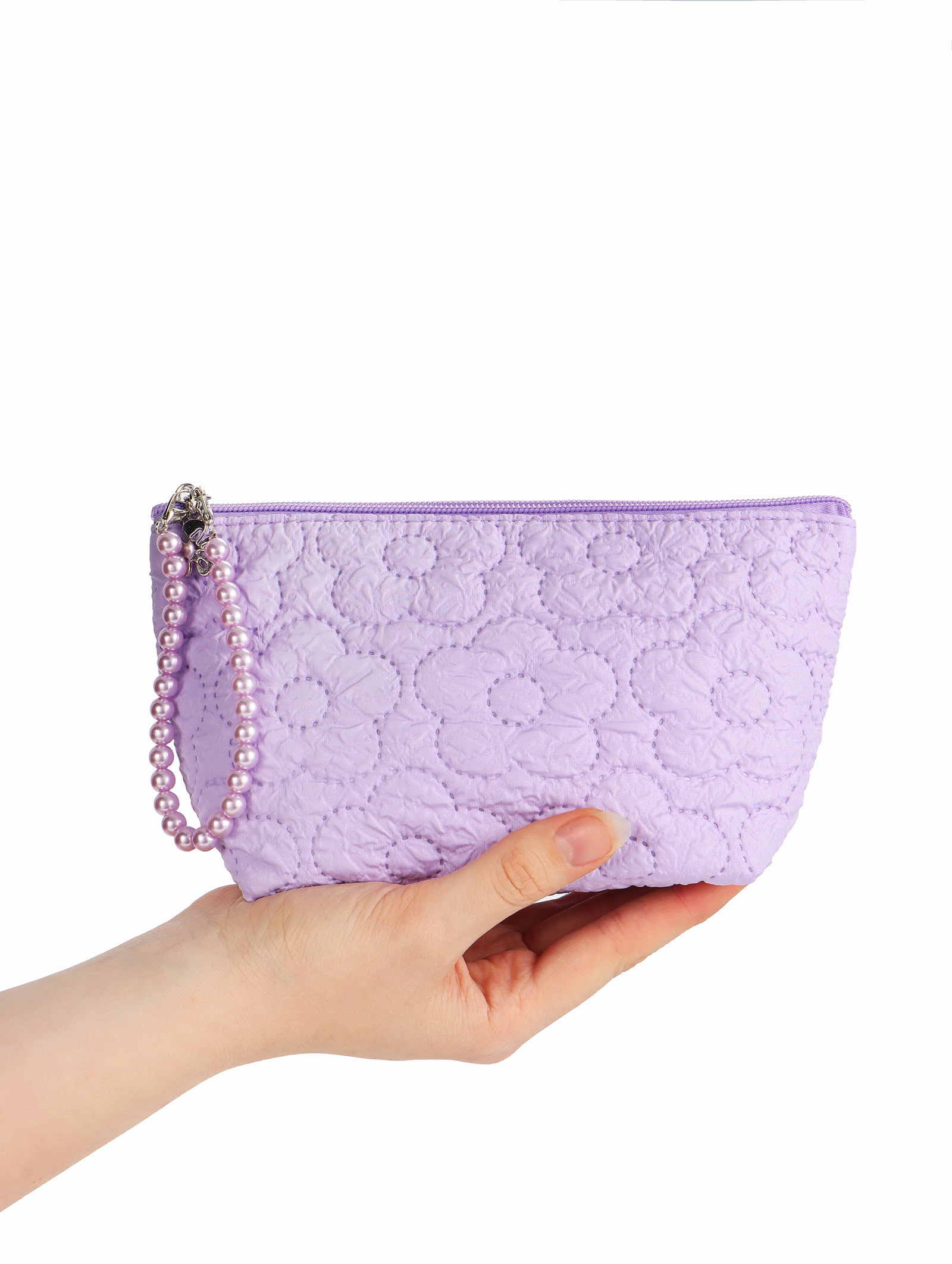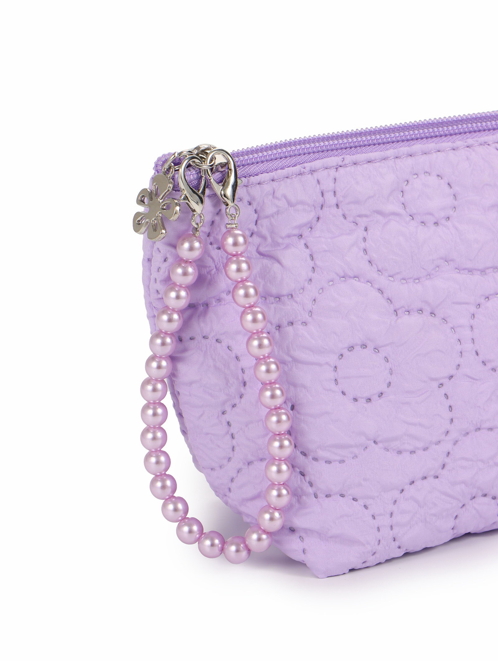 Косметичка женская "Цветочки", на молнии, ручка из бусин, сиреневая, 6x22x16 см., Китай