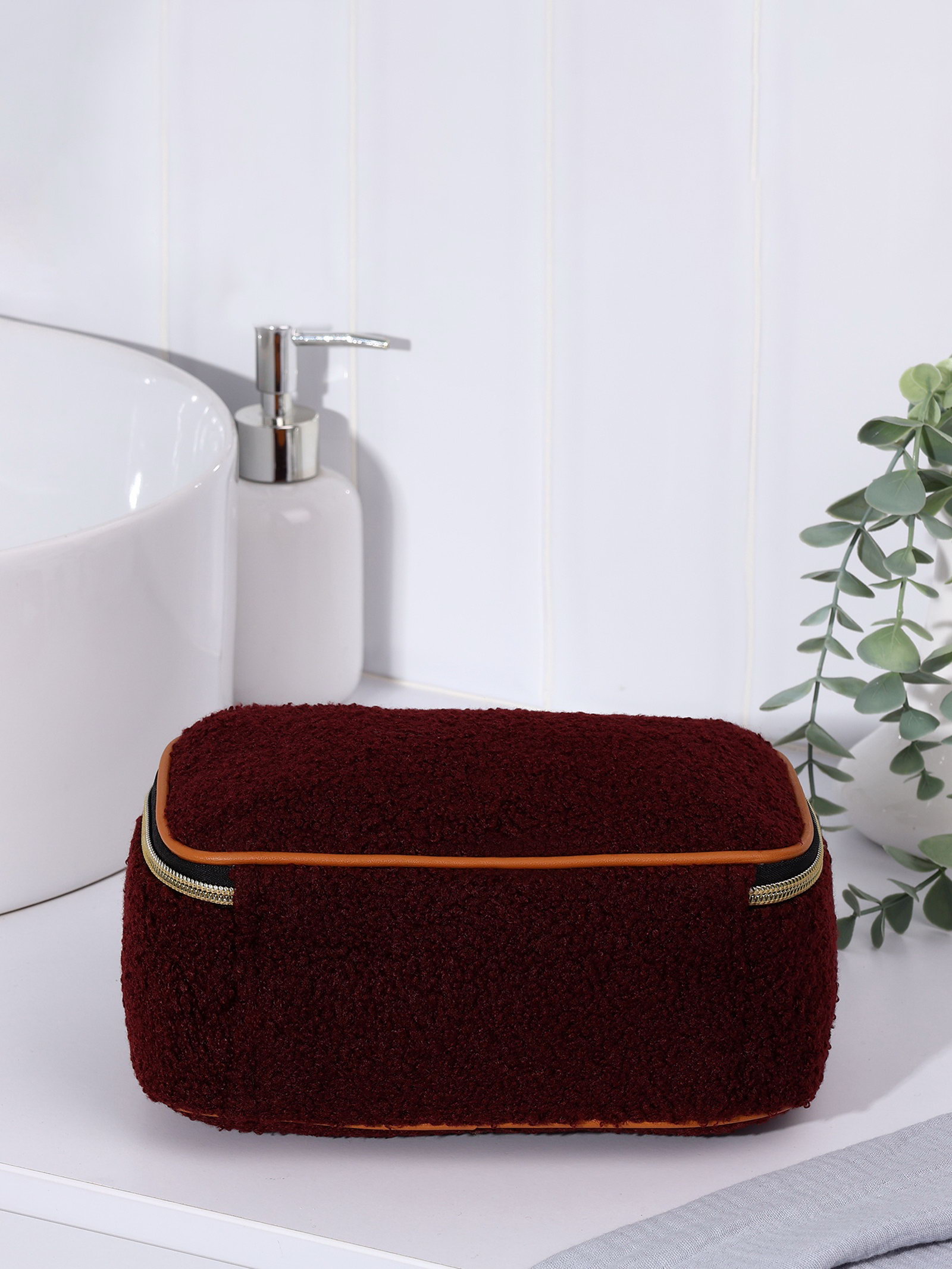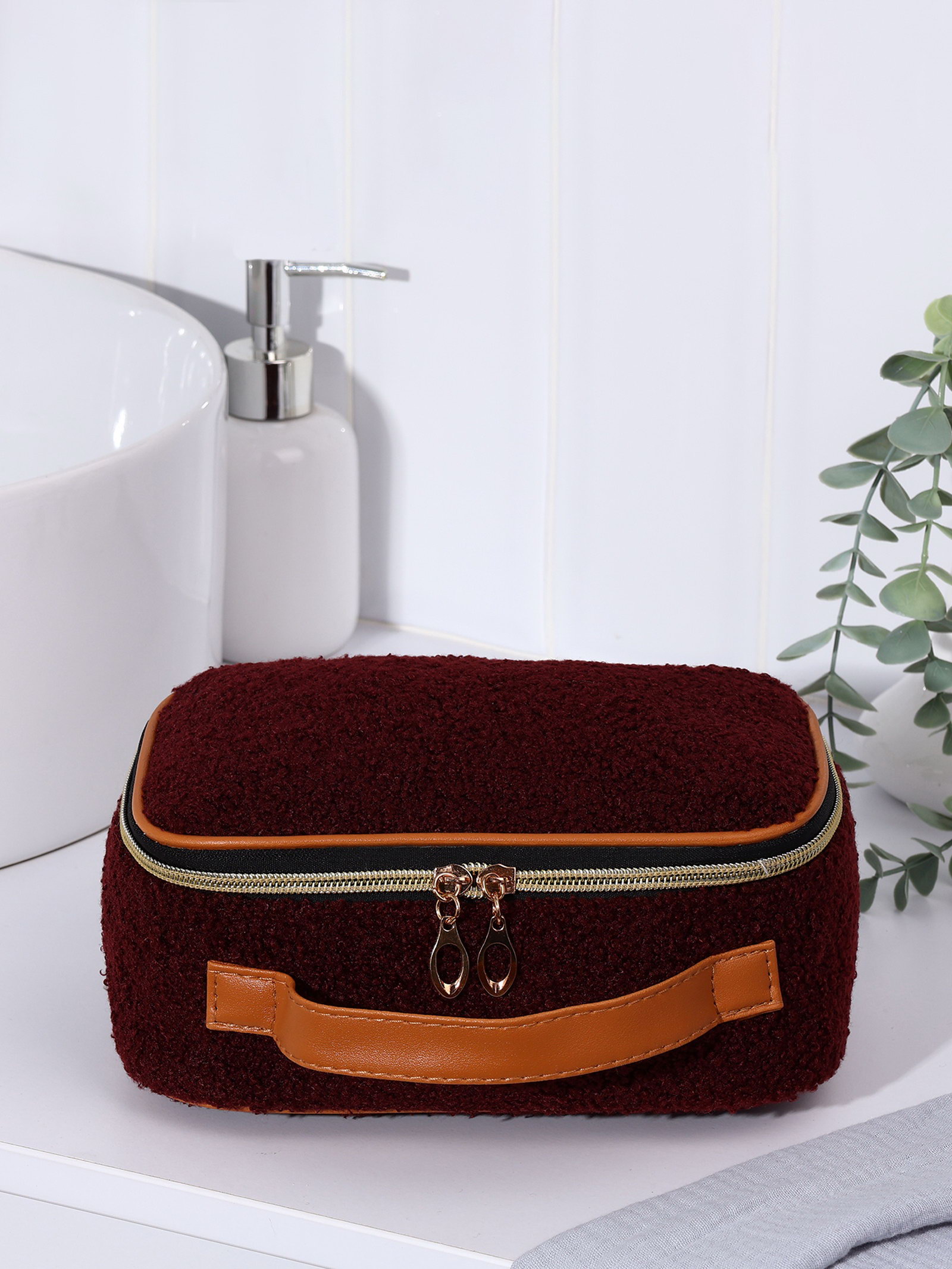 Косметичка-сундучок на молнии, на подкладке, плюшевая, с ручкой, бордовая, 9x20x14 см., КИТАЙ