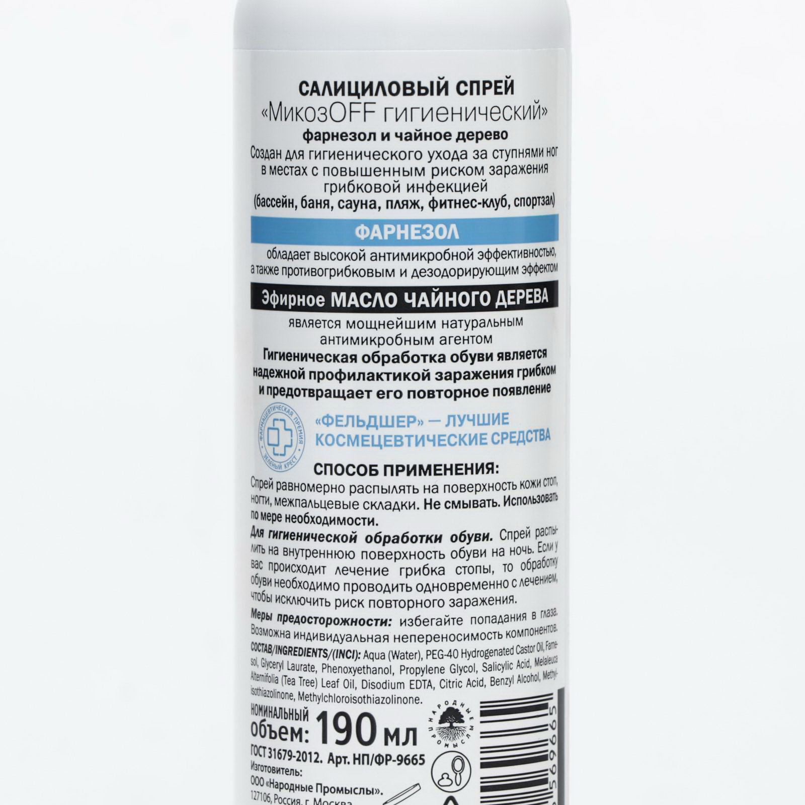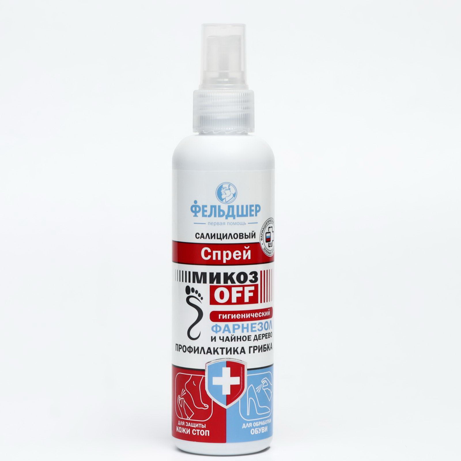 Салициловый спрей для ног "МикозOFF гигиенический" фарнезол и чайное дерево, 190 мл, 4.5x4.5x18.3 см., Фельдшер, Россия