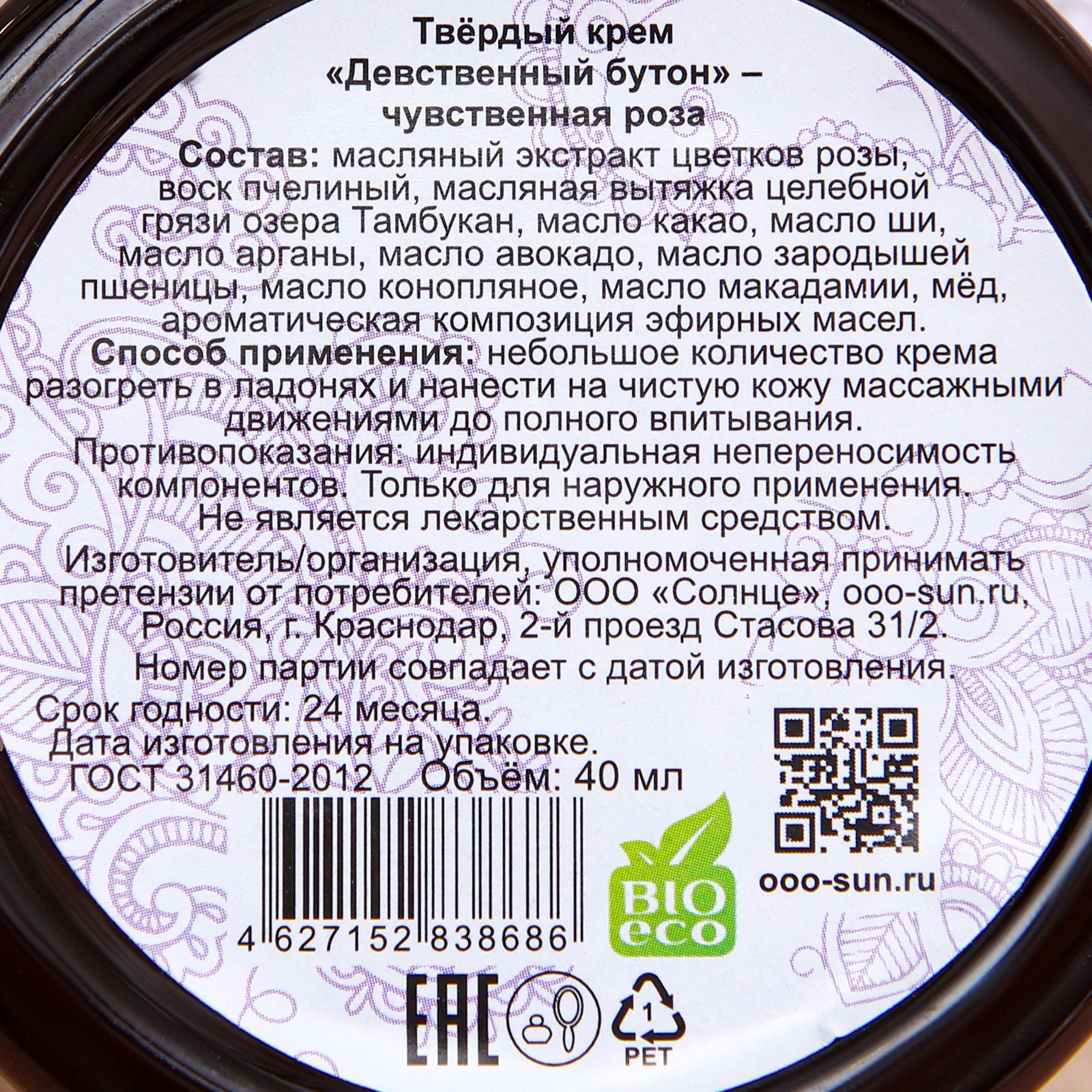 Размер упаковки: 6.5 x 3 x 6.5 см. tnved: 3304990000 tnved: 3304990000 Температурное ограничение: Нет Область применения: Для тела Назначение: Универсальные Вес, г/Объём, мл: 40 Волшебное средство очарования и истинной нежности. Натуральные полезные компоненты твёрдого крема "Девственный бутон", глубоко проникая в слои кожи насыщают их незаменимы микроэлементами, стимулируют выработку естественного коллагена в эпидермисе, омолаживают и выравнивают структуру кожи, активно восстанавливают, сохраняют естественную влагу, крем защищает от солнечных лучей, обветриваний, шелушений. Сладкий аромат розового масла, вдохновляет и придает коже роскошное ощущение гладкого шёлка. Состав: масляный экстракт цветков розы, воск пчелиный, масляная вытяжка целебной грязи озера Тамбукан, масло какао, масло ши, масло арганы, масло авокадо, масло зародышей пшеницы, масло конопляное, масло макадамии, мёд, ароматическая композиция эфирных масел. Способ применения: небольшое количество крема разогреть в ладонях и нанести на чистую кожу массажными движениями до полного впитывания. | ||