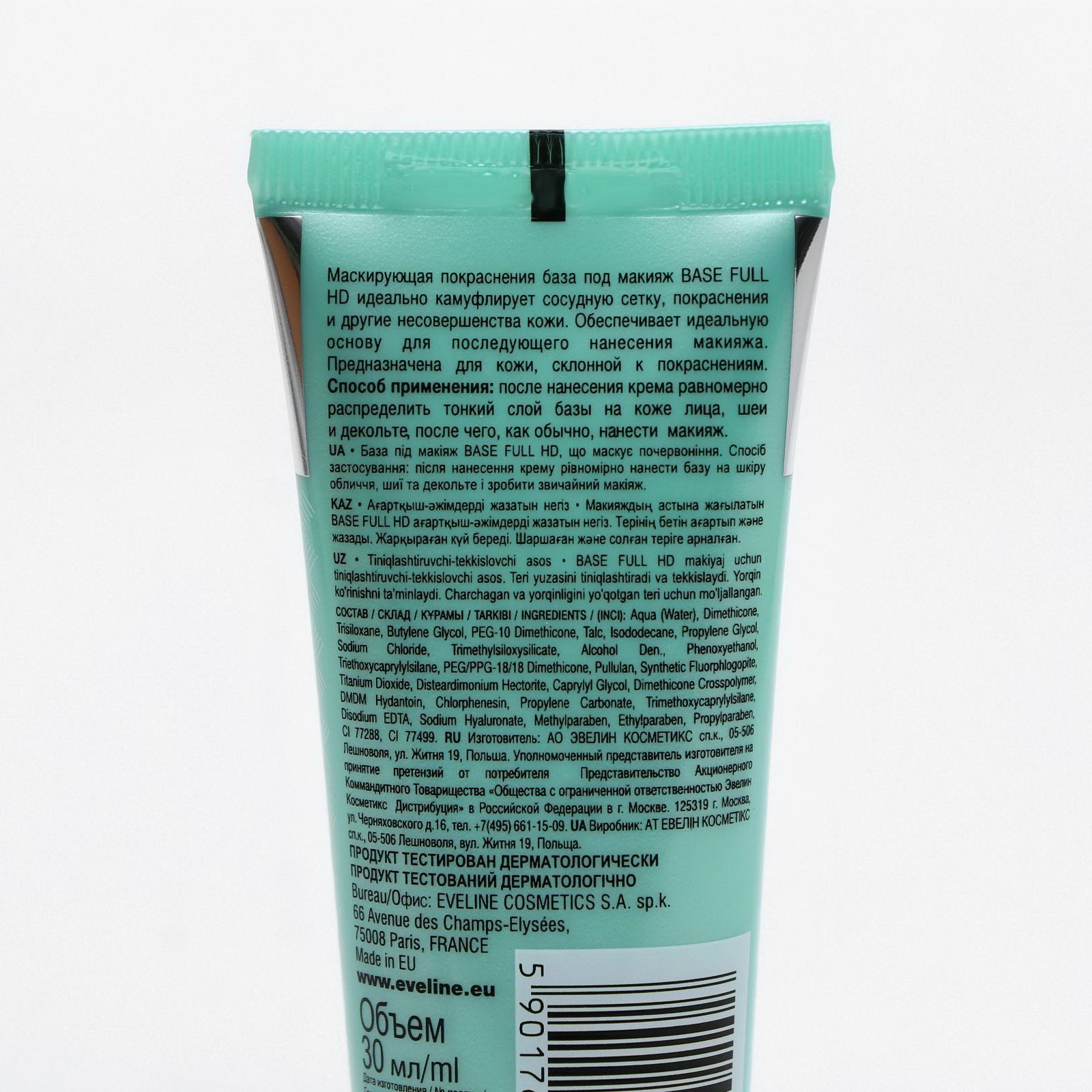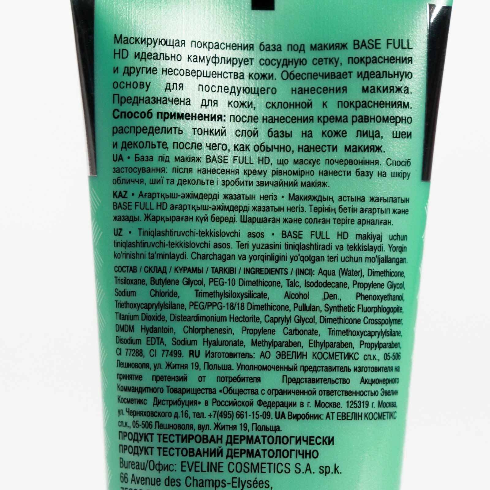 База под макияж Base Full HD "Маскирующая покраснения", 30 мл, 4.6x2.7x12.3 см., Eveline, Польша
