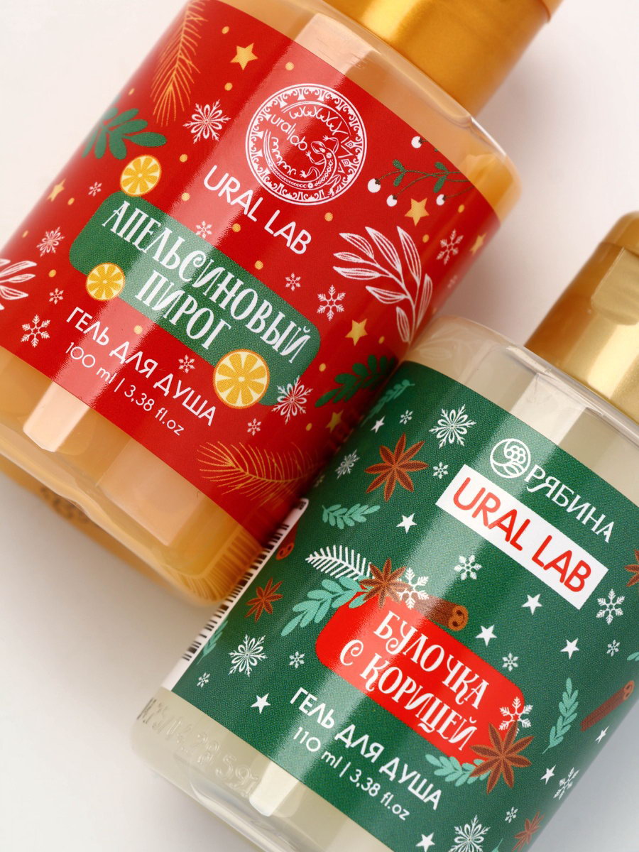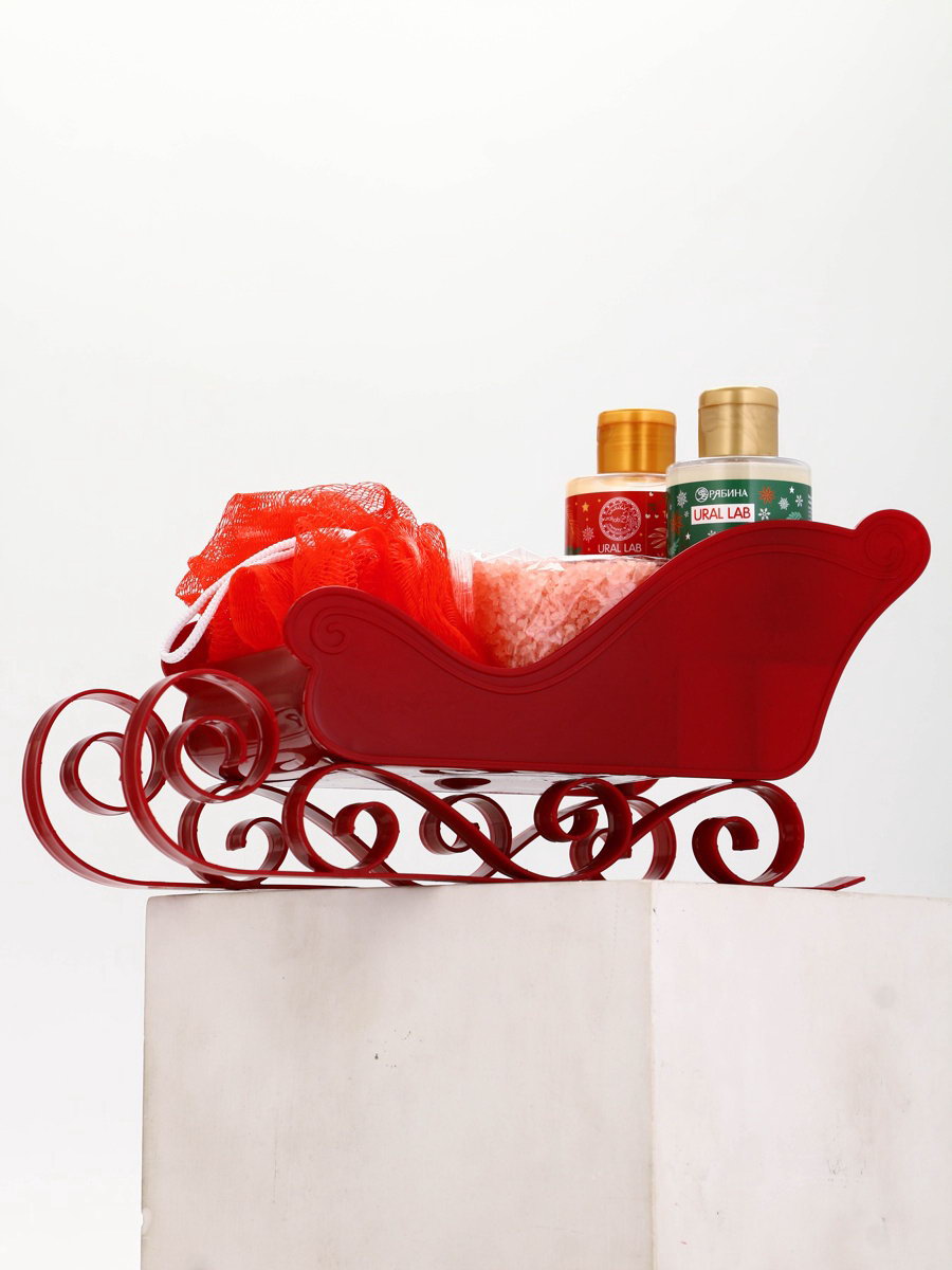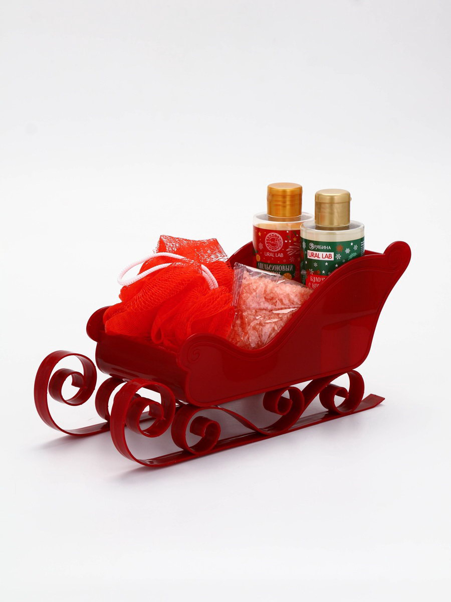 Подарочный набор новогодний в санях: гель для душа 2 шт., соль для ванны и мочалка, URAL LAB, Россия
