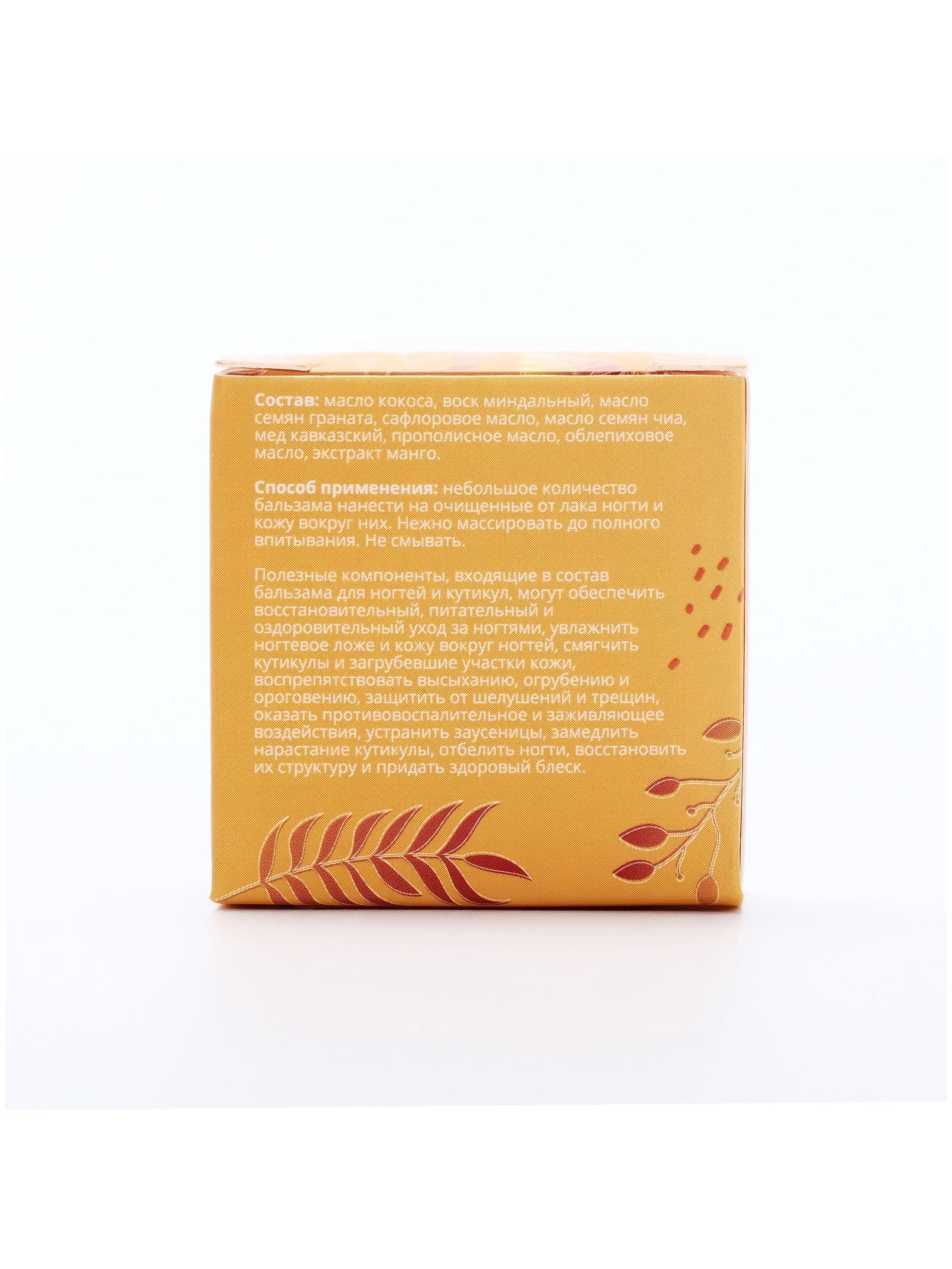 Размер упаковки: 4 x 4 x 2 см. Вид: Бальзам tnved: 3304300000 tnved: 3304300000 Натуральный питательный бальзам для ногтей и кутикулы смягчает и увлажняет кутикулу и боковые валики, предотвращает образование заусенцев. Тающая текстура гарантирует легкое распределение по коже и ногтевой пластине. Бальзам является маслом для кутикулы в твердом виде. Рекомендуется для постоянного и курсового использования. Полезные компоненты, входящие в состав бальзама для ногтей и кутикул, могут обеспечить: