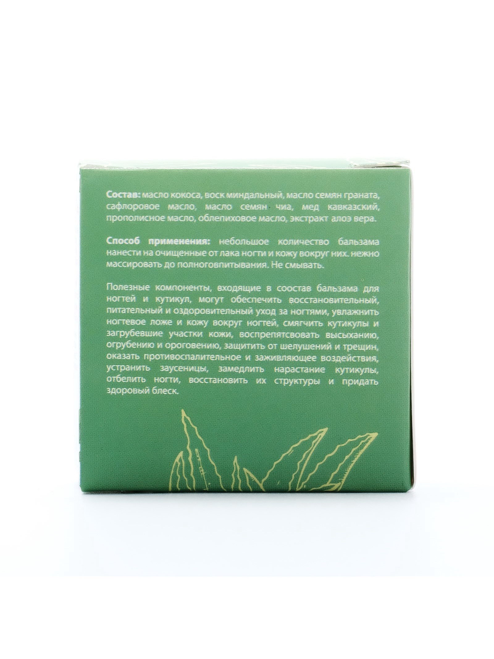 Размер упаковки: 4 x 4 x 2 см. Вид: Бальзам Вид: Бальзам tnved: 3304300000 Натуральный питательный бальзам для ногтей и кутикулы смягчает и увлажняет кутикулу и боковые валики, предотвращает образование заусенцев. Тающая текстура гарантирует легкое распределение по коже и ногтевой пластине. Бальзам является маслом для кутикулы в твердом виде. Рекомендуется для постоянного и курсового использования. Полезные компоненты, входящие в состав бальзама для ногтей и кутикул, могут обеспечить: