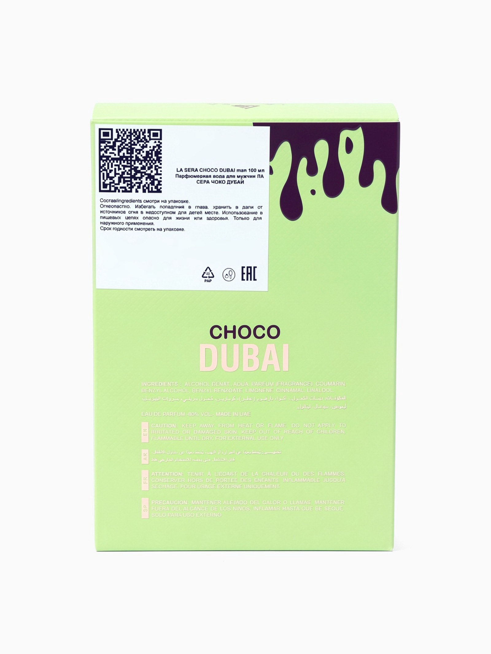 Группа ароматов: Восточные, Гурманские Базовые ноты: Бобы тонка, Ваниль Средние ноты: Фисташки, Шоколад Верхние ноты: Бергамот, Фисташки Размер упаковки: 5.5 x 16.5 x 11.5 см. tnved: 3303009000 Маркировка: Честный знак Семейство аромата: Гурманские Вид дозатора: Распылитель Температурное ограничение: Нет Вид: Парфюмерная вода Парфюмерная вода La Sera CHOCO DUBAI это роскошный унисекс-аромат, вдохновлённый мотивом Dubai Famous Chocolate от Sidonie Lancesseur, выпущенным в 2025 году. Он сочетает в себе восточную гурманскую чувственность и современную элегантность, создавая неповторимый аромат для мужчин и женщин, которые ценят сладость, тепло и глубину аромата. Ароматическая композиция