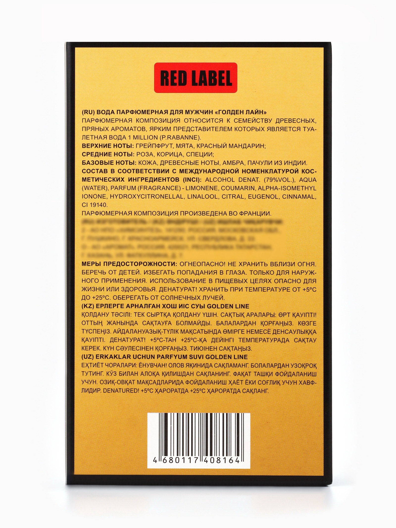 Группа ароматов: Древесные, Пряные Верхние ноты: Грейпфрут, Красный мандарин, Мята Базовые ноты: Амбра, Древесные акценты, Кожа, Пачули Средние ноты: Корица, Роза, Специи Размер упаковки: 7.5 x 3 x 13 см. tnved: 3307900000 Температурное ограничение: Нет Для кого: Для мужчины Вид: Парфюмерная вода Вид дозатора: Распылитель Парфюмерная вода Golden Line это смелый, энергичный и яркий мужской аромат, созданный для уверенных в себе мужчин, которые любят привлекать внимание и оставлять незабываемое впечатление. По мотивам легендарного 1 Million (Paco Rabanne), он сочетает дерзкую сладость, пряные акценты и теплоту древесных нот, создавая уникальный и притягательный шлейф. Композиция открывается яркими цитрусовыми нотами апельсина и грейпфрута, придающими энергии и свежести. В сердце аромата звучат насыщенные пряные акценты, создающие динамичность и характер. Базовые ноты тёплый древесный аккорд, кожа и мускус формируют стойкий, роскошный шлейф, который подчёркивает харизму и уверенность мужчины. Флакон объёмом 100 мл удобен для ежедневного использования и путешествий. Аромат легко наносится, раскрывается на коже в течение дня и оставляет за собой запоминающийся шлейф, делая образ завершённым и элегантным. Преимущества Golden Line: