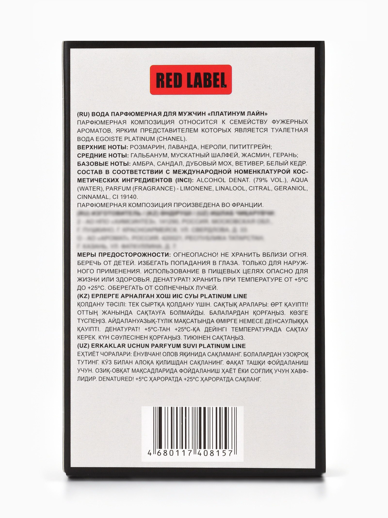 Верхние ноты: Лаванда, Нероли, Розмарин Средние ноты: Гальбанум, Герань, Жасмин, Шалфей Базовые ноты: Амбра, Белый кедр, Ветивер, Дубовый мох, Сандал/Сантал Размер упаковки: 7.5 x 3 x 13 см. tnved: 3307900000 Температурное ограничение: Нет Группа ароматов: Фужерные Для кого: Для мужчины Вид: Парфюмерная вода Вид дозатора: Распылитель Парфюмерная вода Platinum Line это элегантный и утончённый мужской аромат, созданный для уверенных в себе мужчин, ценящих стиль, чистоту линий и выразительность образа. По мотивам легендарного Egoiste Platinum (Chanel), он сочетает свежие, древесные и металлические акценты, создавая эффектный, благородный шлейф. Аромат открывается яркими цитрусовыми и зелёными нотами, придающими бодрость и свежесть. В сердце композиции раскрываются лёгкие пряные и цветочные нюансы, создавая ощущение гармонии и утончённости. Базовые ноты древесина, мускус и тёплые акценты металла обеспечивают стойкость и благородный, современный шлейф, который подчёркивает индивидуальность и уверенность мужчины. Флакон объёмом 100 мл удобен для ежедневного использования и путешествий. Аромат легко наносится, раскрывается на коже в течение дня и оставляет после себя мягкий, выразительный и элегантный шлейф. Преимущества Platinum Line: