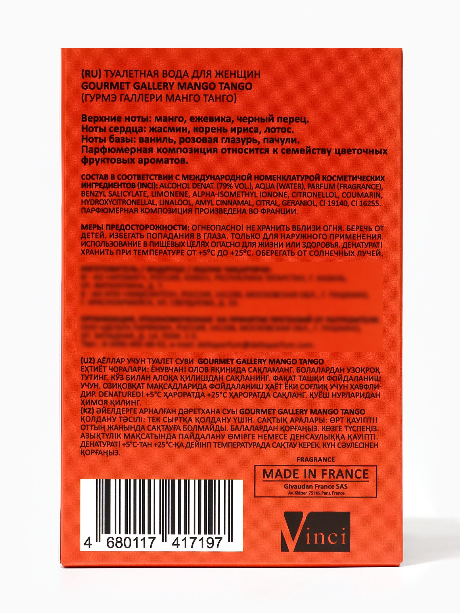 Верхние ноты: Ежевика, Манго, Перец Средние ноты: Жасмин, Ирис, Лотос Группа ароматов: Фруктовые, Цветочные Базовые ноты: Ваниль, Пачули, Розовая глазурь Размер упаковки: 8 x 6 x 12 см. tnved: 3303009000 Температурное ограничение: Нет Честный знак: Честный знак Вид: Туалетная вода Для кого: Для женщины Вид дозатора: Распылитель Gourmet Gallery Mango Tango это аромат, наполненный энергией тропического солнца, радостью жизни и лёгкостью движения. Он создан для женщин, которые не боятся выделяться, живут в ритме страсти и наслаждаются каждым моментом. Этот аромат как летний танец под открытым небом, искрящийся и манящий. С первых мгновений Mango Tango раскрывается вспышкой сочного, сладкого манго, свежего и спелого, словно только что сорванного с дерева. К нему присоединяются ноты тропических фруктов и цитрусов, придающие композиции яркость и темперамент. Аромат переливается на коже, словно солнечные блики, вызывая улыбку и прилив хорошего настроения. Постепенно звучание становится мягче, теплее проявляются сладкие фруктово-кремовые оттенки, создающие ощущение нежности и комфорта. В финале аромат обволакивает лёгким шлейфом ванили и мягкого мускуса, оставляя ощущение сладкого удовольствия и нежного тепла. Mango Tango это аромат-жизнелюб. Он создан для тех, кто выбирает позитив, движение и яркость, кто чувствует вкус жизни и не боится быть заметной. Этот парфюм подойдёт для любого времени года, но особенно раскрывается в солнечные дни, когда хочется ощущать свежесть и свободу. Идеален для повседневного ношения, отдыха, прогулок, путешествий и летних вечеров. Его аромат делает образ живым, женственным и наполненным радостью. Gourmet Gallery Mango Tango это не просто туалетная вода. Это аромат-эмоция, аромат-улыбка, аромат, который танцует на коже. Флакон: 100 мл стильный и яркий, как солнечный день, заключает в себе летнюю энергию и ощущение счастья, которое можно носить с собой. | ||