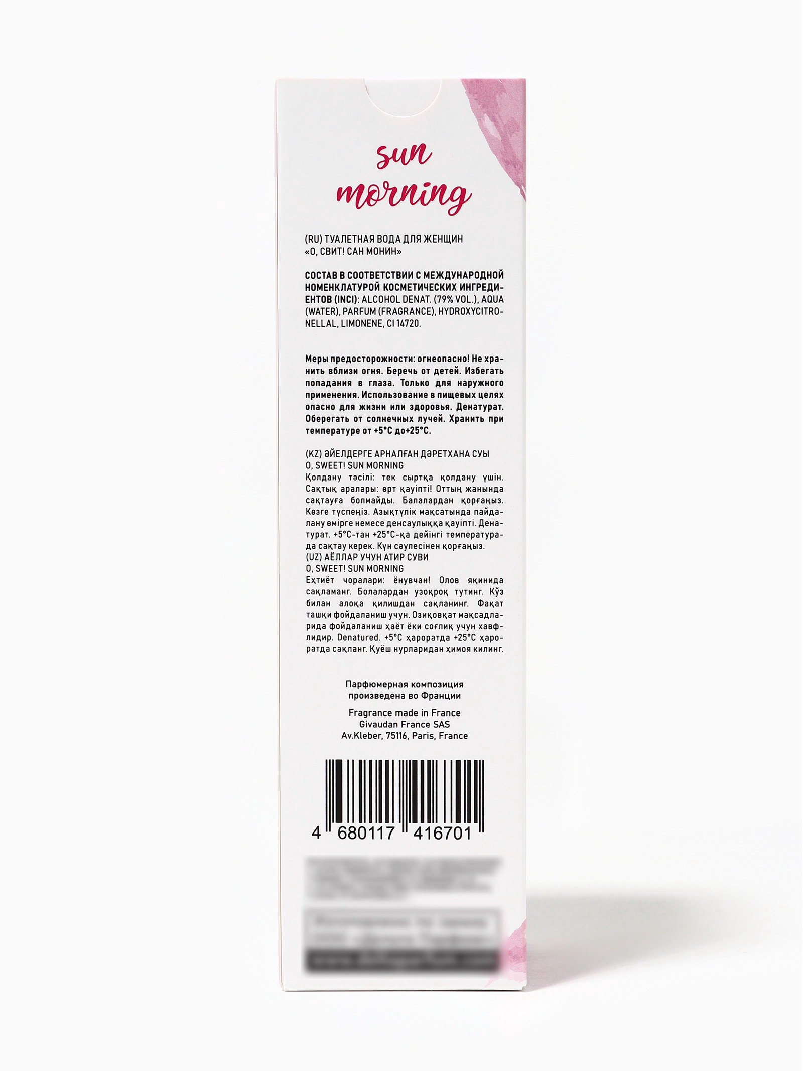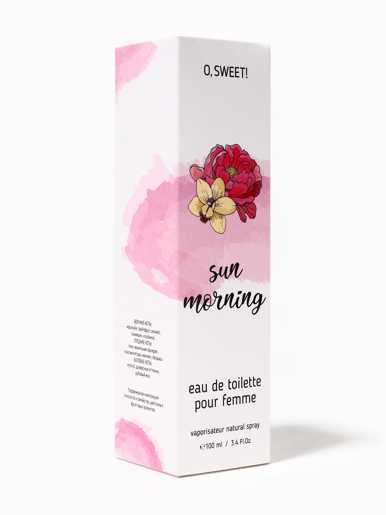 Группа ароматов: Фруктовые, Цветочные Верхние ноты: Ананас, Грейпфрут, Клубника, Маракуйя, Танжерин Средние ноты: Жасмин, Ландыш, Орхидея, Пион, Ягоды Базовые ноты: Древесные акценты, Дубовый мох, Мускус Размер упаковки: 4.5 x 4.5 x 17 см. tnved: 3303009000 Температурное ограничение: Нет Честный знак: Честный знак Вид дозатора: Распылитель Вид: Туалетная вода Для кого: Для женщины O, Sweet! Sun Morning это аромат солнечного утра, свежести и лёгкой радости. Он создан для женщин, которые любят ощущение свободы, яркие эмоции и позитивное настроение. Этот парфюм словно первые солнечные лучи, пробивающиеся сквозь окно, наполняя день теплом и энергией. С первых мгновений аромат раскрывается свежими, яркими и лёгкими нотами, создавая ощущение бодрости и чистоты. Постепенно в композицию вступают мягкие цветочные и фруктовые оттенки, которые придают аромату женственность, лёгкость и игривость. В шлейфе остаются теплые, нежные акценты, создавая ощущение гармонии и внутреннего комфорта. Sun Morning идеально подходит для дневного использования, прогулок, работы и солнечных дней. Он подчеркивает женственность, позитив и индивидуальность своей обладательницы, наполняя каждый день светом и радостью. Аромат оставляет за собой лёгкий, свежий и манящий шлейф, создавая ощущение бодрости, лёгкости и внутреннего сияния. O, Sweet! Sun Morning это парфюм для женщин, которые ценят оптимизм, ясность и утреннюю свежесть, даря себе и окружающим настроение солнечного утра. Флакон: 100 мл стильный и яркий, отражает концепцию аромата: свежесть, тепло и солнечное настроение. | ||