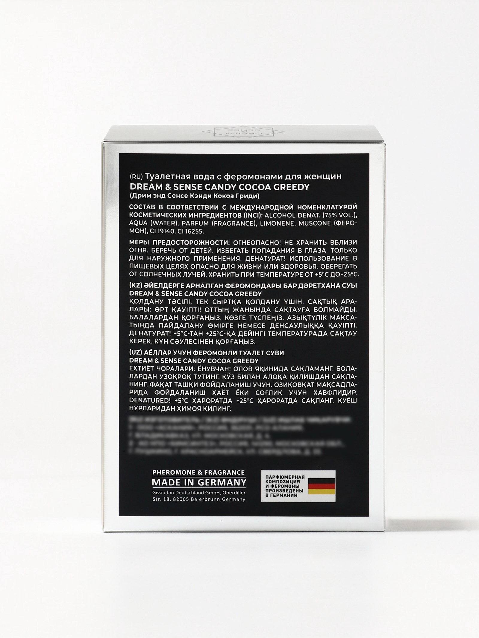 Группа ароматов: Восточные, Гурманские Базовые ноты: Апельсин, Бобы тонка, Ваниль, Какао, Кофе, Сухофрукты Размер упаковки: 8.5 x 3.5 x 12.5 см. tnved: 3303009000 Температурное ограничение: Нет Честный знак: Честный знак Вид дозатора: Распылитель Вид: Туалетная вода Для кого: Для женщины Dream & Sense Candy Cocoa Greedy это аромат для женщин, которые обожают сладкие и гурманские композиции, дарящие радость и комфорт. Он создан для тех, кто любит игру соблазна, утонченную женственность и моменты наслаждения. Этот парфюм словно тёплый шоколадный десерт, который хочется носить с собой весь день. С первых мгновений Candy Cocoa Greedy раскрывается насыщенной шоколадной сладостью, дополненной мягкими карамельными и ванильными акцентами. Его композиция дарит ощущение уюта, тепла и лёгкой игривости, создавая настроение праздника и радости. В сердце аромата проявляются мягкие фруктовые и цветочные оттенки, добавляющие женственность и воздушность. База аромата оставляет тёплый, притягательный и стойкий шлейф, словно окутывая кожу бархатной сладкой вуалью. Candy Cocoa Greedy идеально подходит для повседневного использования, уютных вечеров, встреч с друзьями или романтических моментов, когда хочется подчеркнуть мягкость и игривость. Аромат раскрывает харизму и женственность, создавая образ сладкой, соблазнительной и привлекательной женщины. Парфюм оставляет за собой мягкий, тёплый и манящий шлейф, который сопровождает на протяжении всего дня, создавая атмосферу радости, удовольствия и сладкого комфорта. Флакон: 100 мл стильный, яркий и современный, отражает концепцию аромата: сладость, утонченность и гурманская привлекательность. | ||