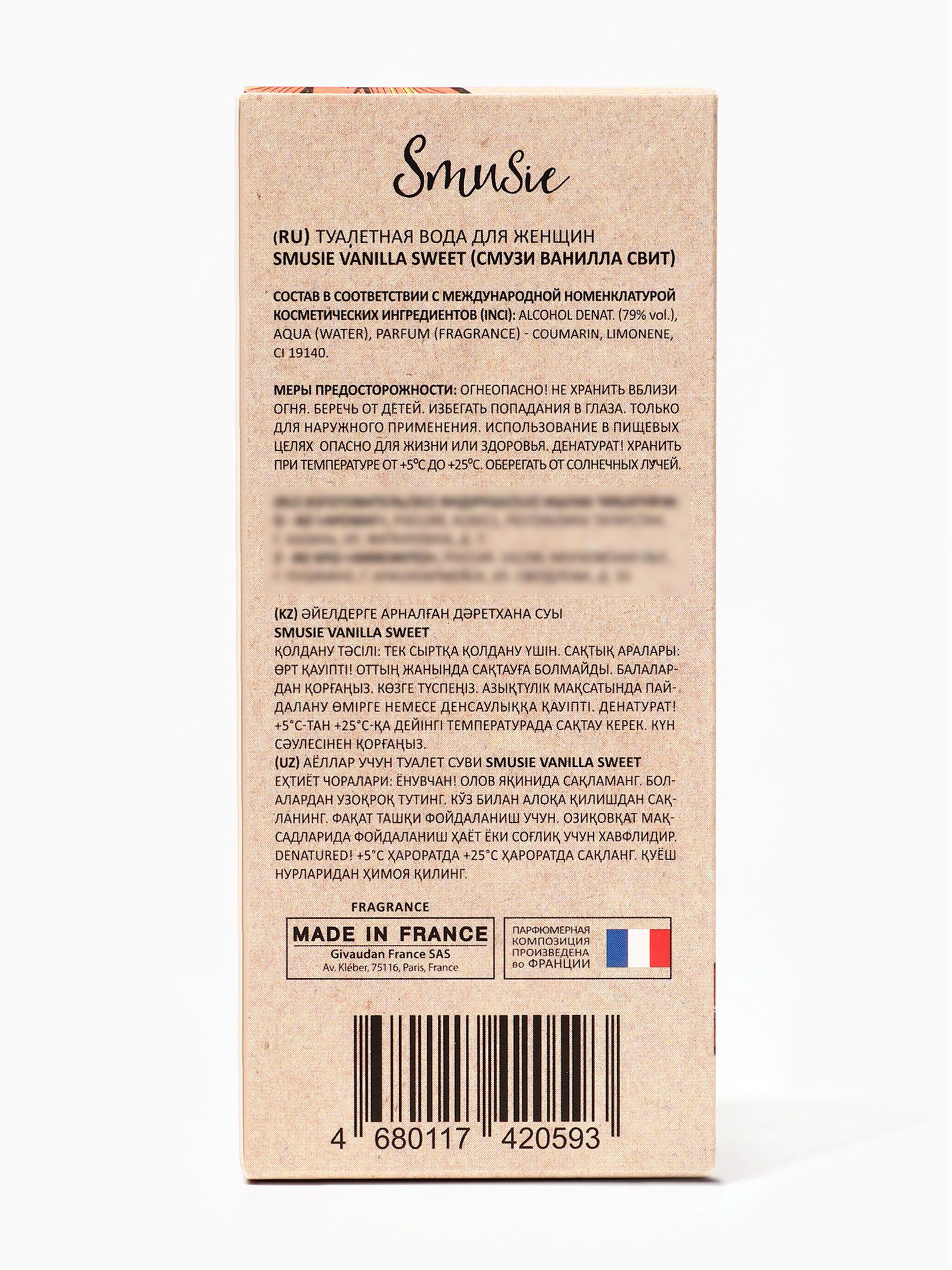 Группа ароматов: Восточные, Гурманские Размер упаковки: 5.5 x 5.5 x 12.5 см. tnved: 3303009000 Температурное ограничение: Нет Честный знак: Честный знак Вид дозатора: Распылитель Вид: Туалетная вода Для кого: Для женщины Базовые ноты: Ваниль Smusie Vanilla Sweet это аромат для женщин, которые любят тепло, уют и сладкие моменты жизни. Он создан для тех, кто ценит мягкость, женственность и утонченную привлекательность, подчеркивая свою харизму с помощью нежных и сладких акцентов. Этот парфюм словно теплое объятие ванили, которое окутывает атмосферой комфорта и нежности. С первых мгновений Vanilla Sweet раскрывается сладкими и мягкими акцентами ванили, создавая ощущение уюта, радости и гармонии. В сердце композиции проявляются лёгкие цветочные и карамельные оттенки, придающие аромату женственность, нежность и деликатность. Базовые ноты создают стойкий, теплый и манящий шлейф, который сопровождает на протяжении всего дня, подчёркивая индивидуальность и мягкую привлекательность своей обладательницы. Smusie Vanilla Sweet идеально подходит для повседневного использования, уютных вечеров, романтических встреч и моментов, когда хочется подчеркнуть женственность и создать атмосферу комфорта. Аромат раскрывает мягкость, утонченность и сладкую притягательность женщины, создавая образ привлекательной и гармоничной натуры. Парфюм оставляет за собой сладкий, тёплый и нежный шлейф, создавая ощущение радости, уюта и женской гармонии. Флакон: 100 мл стильный, лаконичный и современный, отражает концепцию аромата: сладость, тепло и женственность. | ||