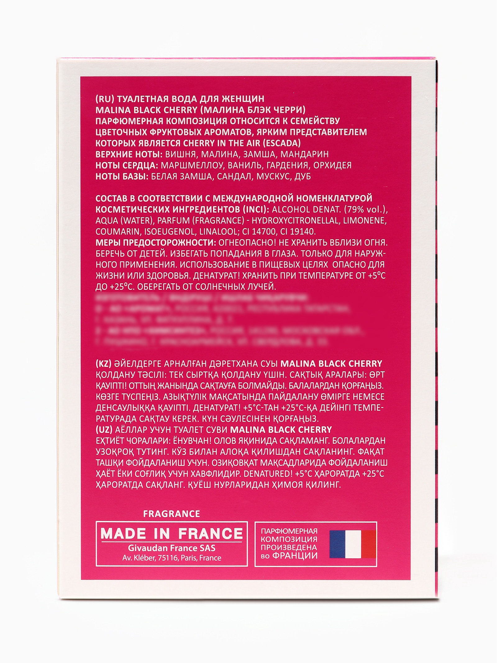 Верхние ноты: Вишня, Замша, Малина, Мандарин Базовые ноты: Дуб, Замша, Мускус, Сандал/Сантал Средние ноты: Ваниль, Гардения, Маршмеллоу, Орхидея Группа ароматов: Фруктовые, Цветочные Размер упаковки: 8.5 x 3.5 x 12.5 см. tnved: 3303009000 Температурное ограничение: Нет Честный знак: Честный знак Вид: Туалетная вода Для кого: Для женщины Вид дозатора: Распылитель Malina Black Cherry это аромат для женщин, которые любят страсть, глубину и сладкую загадочность. Он создан для тех, кто хочет подчеркнуть свою женственность и обаяние, оставляя после себя незабываемый след. Этот парфюм словно спелая чёрная вишня, сочная и насыщенная, манящая своей яркостью и интригой. С первых мгновений Black Cherry раскрывается насыщенными ягодными акцентами, создавая ощущение сладости, свежести и притягательности. В сердце композиции проявляются мягкие цветочные и фруктовые оттенки, придающие аромату женственность, элегантность и глубину. Базовые ноты создают стойкий, тёплый и соблазнительный шлейф, который подчёркивает харизму и индивидуальность своей обладательницы. Malina Black Cherry идеально подходит для вечернего использования, романтических встреч и особых моментов, когда хочется подчеркнуть страсть и привлекательность. Аромат раскрывает женскую силу и магнетизм, создавая образ чувственной, уверенной и обаятельной женщины. Парфюм оставляет за собой глубокий, сладкий и манящий шлейф, создавая атмосферу соблазна, элегантности и загадочности. Флакон: 100 мл стильный, тёмный и современный, отражает концепцию аромата: страсть, женственность и насыщенная сладкая интрига. | ||
