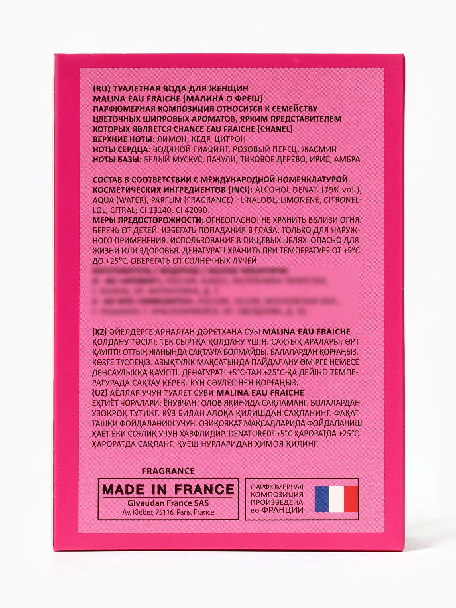 Верхние ноты: Кедр, Лимон, Цитрон Средние ноты: Гиацинт, Жасмин, Розовый перец Базовые ноты: Амбра, Дерево, Ирис, Мускус, Пачули Группа ароматов: Цветочные, Шипровые Размер упаковки: 9 x 4 x 13 см. tnved: 3303009000 Температурное ограничение: Нет Честный знак: Честный знак Вид: Туалетная вода Для кого: Для женщины Вид дозатора: Распылитель Malina Eau Fraiche это аромат для женщин, которые ценят свежесть, лёгкость и естественную гармонию. Он создан для тех, кто любит бодрость, ясность и ощущение чистоты, подчеркивая свою природную женственность и лёгкую привлекательность. Этот парфюм словно утренний свежий бриз, наполняющий день энергией и позитивом. С первых мгновений Eau Fraiche раскрывается прозрачными и сочными нотами, создавая ощущение свежести, бодрости и лёгкости. В сердце композиции проявляются нежные цветочные акценты, которые придают аромату женственность, мягкость и гармоничность. Базовые ноты создают лёгкий, чистый и стойкий шлейф, который сопровождает свою обладательницу на протяжении всего дня, подчёркивая её индивидуальность и свежесть. Malina Eau Fraiche идеально подходит для повседневного использования, прогулок, работы и солнечных дней. Аромат подчёркивает лёгкость, оптимизм и естественную привлекательность женщины, создавая образ свежей, жизнерадостной и уверенной в себе натуры. Парфюм оставляет за собой лёгкий, прозрачный и манящий шлейф, который создаёт ощущение свежести, чистоты и внутренней гармонии. Флакон: 100 мл стильный, современный и прозрачный, отражает концепцию аромата: свежесть, лёгкость и естественная элегантность. | ||