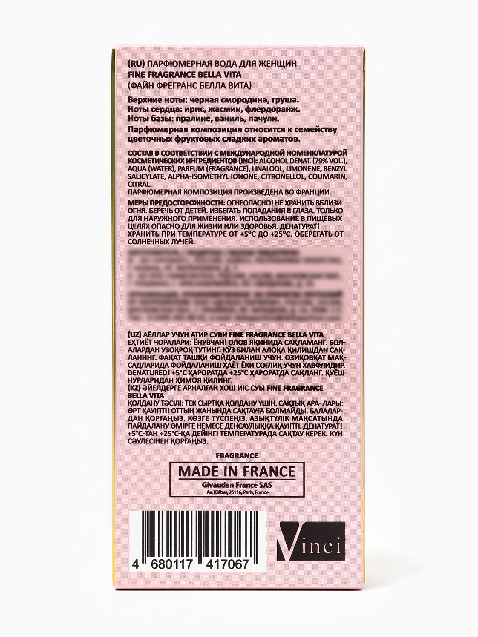 Группа ароматов: Фруктовые, Цветочные Базовые ноты: Бобы тонка, Ваниль, Пачули, Пралине Средние ноты: Апельсиновый цвет (Флёрдоранж), Жасмин, Ирис Верхние ноты: Груша, Смородина Размер упаковки: 5.5 x 3.5 x 12.5 см. tnved: 3307900000 Честный знак: Честный знак Температурное ограничение: Нет Вид: Парфюмерная вода Для кого: Для женщины Вид дозатора: Распылитель Fine Fragrance Bella Vita это аромат для женщин, которые хотят подчеркнуть свою элегантность, утонченность и внутреннюю гармонию. Он создан для тех, кто ценит утончённость, стиль и мягкое обаяние, способное оставлять за собой незабываемое впечатление. Этот парфюм словно гармония жизни, раскрывающая женственность и магнетизм своей обладательницы. С первых мгновений Bella Vita раскрывается свежими и лёгкими нотами, создавая ощущение лёгкости, радости и внутренней гармонии. В сердце аромата проявляются нежные цветочные и мягкие фруктовые акценты, придающие композиции женственность, утончённость и мягкую соблазнительность. Базовые ноты создают стойкий, тёплый и манящий шлейф, подчёркивающий харизму и индивидуальность женщины. Fine Fragrance Bella Vita идеально подходит для повседневного использования, встреч с друзьями, прогулок и романтических свиданий, когда хочется быть обаятельной, стильной и притягательной. Аромат раскрывает внутреннюю уверенность, мягкую женственность и очарование, создавая образ уверенной, гармоничной и притягательной женщины. Парфюм оставляет за собой лёгкий, свежий и манящий шлейф, который сопровождает на протяжении всего дня, создавая атмосферу радости, утончённости и женской привлекательности. Флакон: 50 мл стильный, современный и удобный для повседневного использования, отражает концепцию аромата: гармония, женственность и элегантная притягательность. | ||