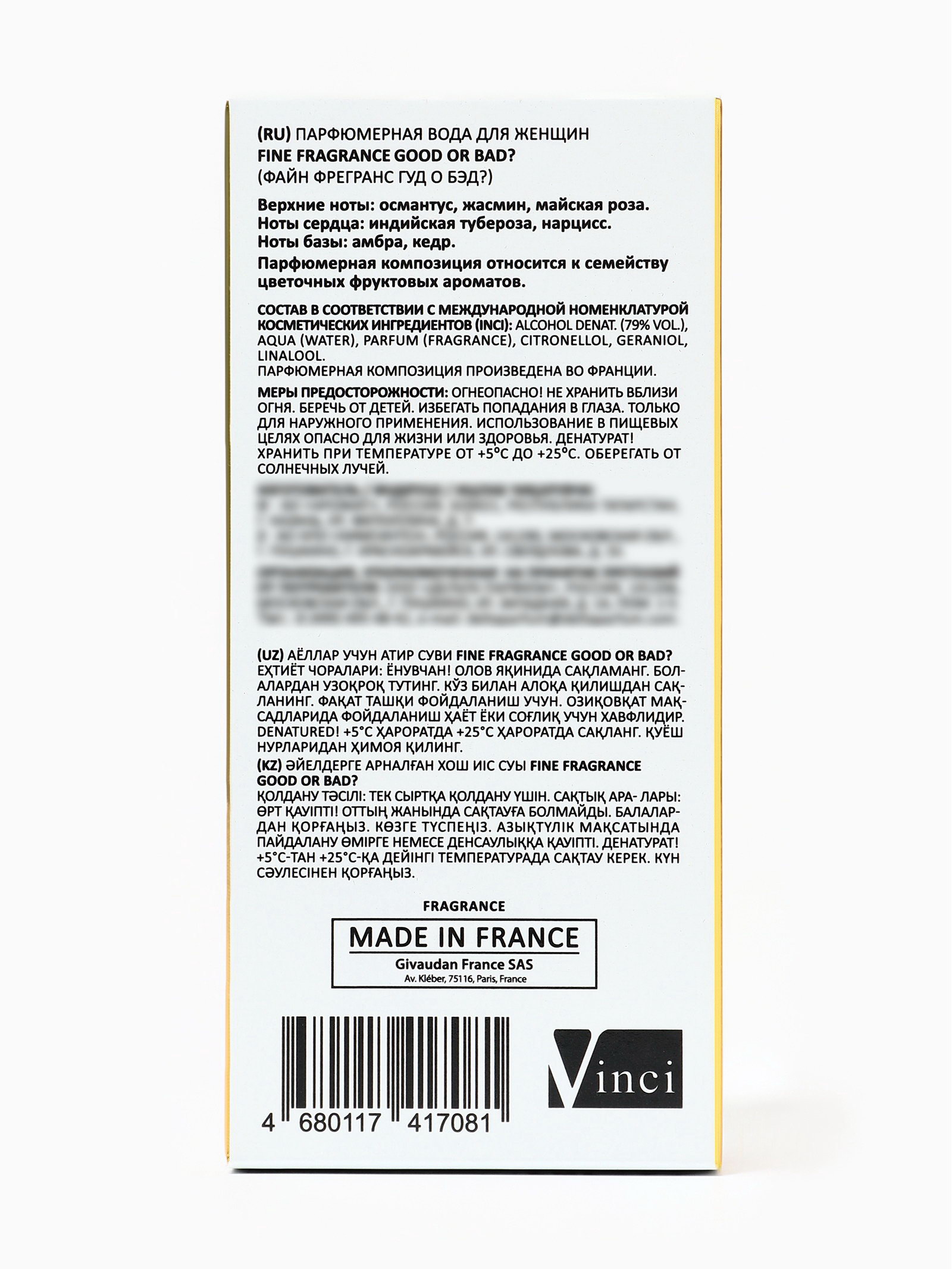 Группа ароматов: Фруктовые, Цветочные Средние ноты: Нарцисс, Тубероза Базовые ноты: Амбра, Кедр Верхние ноты: Жасмин, Османтус, Роза Размер упаковки: 5.5 x 3.5 x 12.5 см. tnved: 3307900000 Честный знак: Честный знак Температурное ограничение: Нет Для кого: Для женщины Вид: Парфюмерная вода Вид дозатора: Распылитель Fine Fragrance Good Or Bad? это аромат для женщин, которые любят баланс между дерзостью и нежностью, смелостью и элегантностью. Он создан для тех, кто хочет подчеркнуть свою многогранность, харизму и способность быть обаятельной в любой ситуации. Этот парфюм словно игра эмоций, раскрывающая женственность с неожиданной интригой. С первых мгновений Good Or Bad? раскрывается свежими и яркими нотами, создавая ощущение энергии, уверенности и лёгкой провокации. В сердце аромата проявляются цветочные и фруктовые акценты, придающие композиции мягкость, элегантность и притягательную женственность. Базовые ноты создают стойкий, тёплый и манящий шлейф, подчёркивающий харизму и индивидуальность своей обладательницы. Fine Fragrance Good Or Bad? идеально подходит для вечерних мероприятий, свиданий и особых случаев, когда хочется быть одновременно загадочной, смелой и притягательной. Аромат раскрывает внутреннюю силу, уверенность и магнетизм женщины, создавая образ харизматичной, обаятельной и многогранной натуры. Парфюм оставляет за собой стойкий, тёплый и манящий шлейф, который сопровождает на протяжении всего вечера, создавая атмосферу интриги, притягательности и женской магнетической силы. Флакон: 50 мл стильный, современный и удобный для использования, отражает концепцию аромата: смелость, женственность и притягательная харизма. | ||