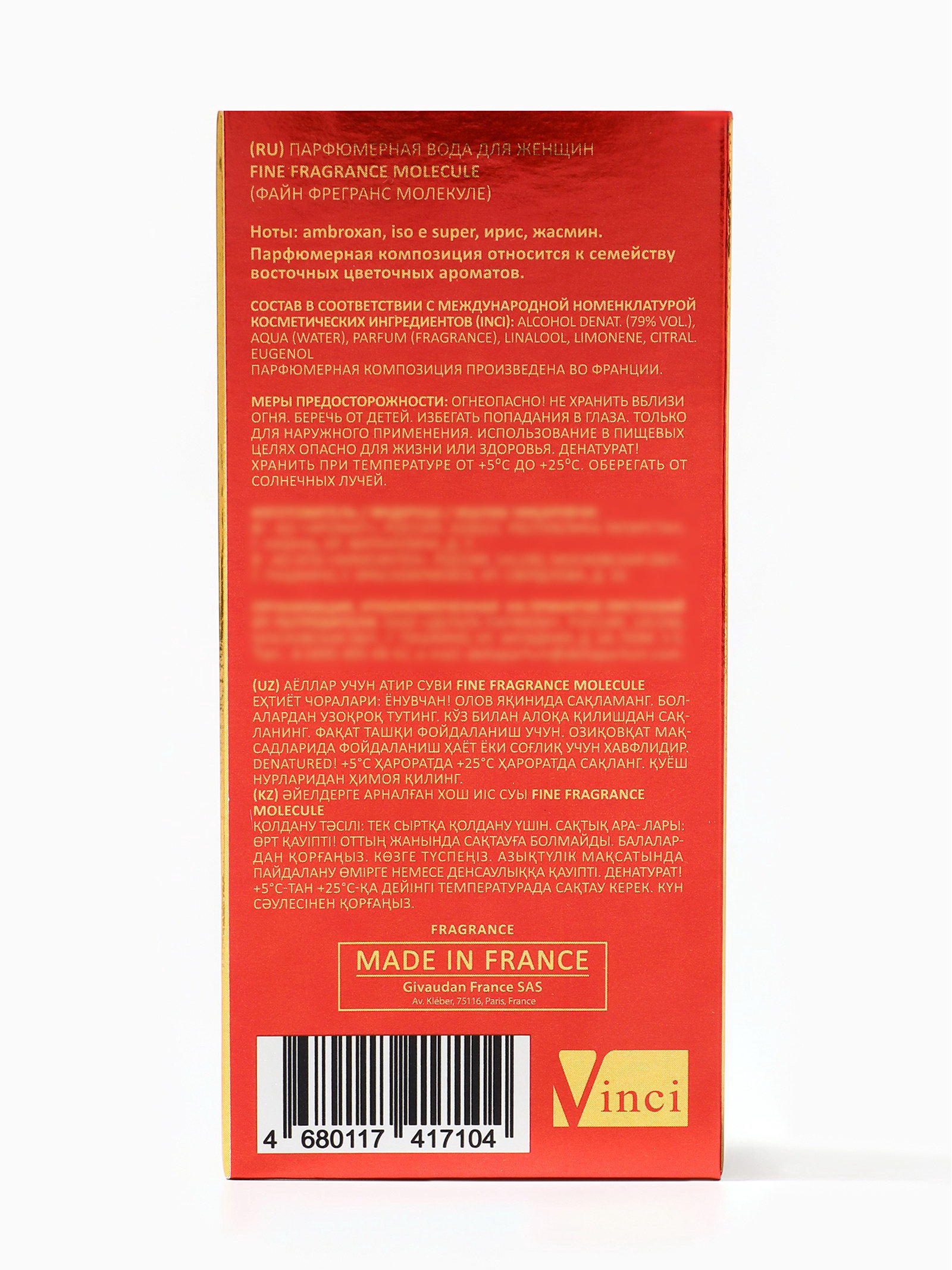 Группа ароматов: Восточные, Цветочные Базовые ноты: Iso E Super, Амброксан, Жасмин, Ирис Размер упаковки: 6 x 3.5 x 12.5 см. tnved: 3307900000 Честный знак: Честный знак Температурное ограничение: Нет Вид: Парфюмерная вода Для кого: Для женщины Вид дозатора: Распылитель Fine Fragrance Molecule это аромат для женщин, которые ценят минимализм, утончённость и современную элегантность. Он создан для тех, кто хочет подчеркнуть свою индивидуальность, уверенность и способность притягивать внимание лёгкостью и гармонией. Этот парфюм словно невидимая магия, раскрывающая женственность через чистоту и стиль. С первых мгновений Molecule раскрывается лёгкими и прозрачными нотами, создавая ощущение свежести, лёгкости и внутренней гармонии. В сердце аромата проявляются мягкие цветочные и слегка древесные акценты, придающие композиции элегантность, утонченность и лёгкую соблазнительность. Базовые ноты создают стойкий, мягкий и магнетический шлейф, подчёркивающий харизму и индивидуальность своей обладательницы. Fine Fragrance Molecule идеально подходит для повседневного использования, деловых встреч, прогулок и свиданий, когда хочется быть уверенной, элегантной и привлекательной. Аромат раскрывает внутреннюю силу, женственность и стиль, создавая образ современной, гармоничной и притягательной женщины. Парфюм оставляет за собой лёгкий, прозрачный и магнетический шлейф, который сопровождает на протяжении всего дня, создавая атмосферу утончённости, гармонии и женской притягательности. Флакон: 50 мл стильный, минималистичный и удобный для повседневного использования, отражает концепцию аромата: чистота, элегантность и современная женская привлекательность. | ||