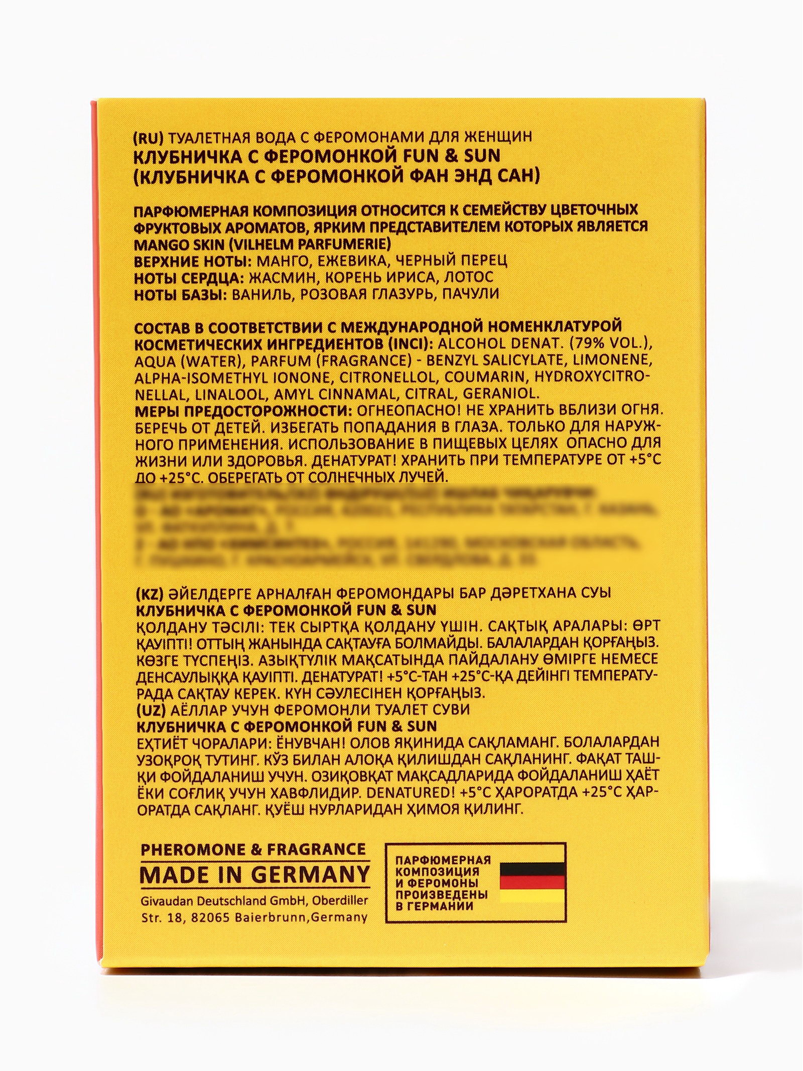 Для кого: Для женщины, Для неё Группа ароматов: Фруктовые, Цветочные Средние ноты: Жасмин, Ирис, Лотос Верхние ноты: Ежевика, Манго, Перец Базовые ноты: Ваниль, Пачули Размер упаковки: 6.5 x 6.5 x 9 см. tnved: 3303009000 Честный знак: Честный знак Температурное ограничение: Нет Вид: Туалетная вода Вид дозатора: Распылитель Этот парфюм настоящая гармония контрастов, объединяющая сладость, пряность и изысканную элегантность. С первых мгновений верхние ноты манго, ежевики и черного перца создают ощущение бодрящей свежести, фруктовой сладости и лёгкой пикантной интриги, привлекающей внимание с первого взгляда. В сердце аромата раскрываются жасмин, корень ириса и лотос, придавая композиции изысканность, цветочную мягкость и утонченность. Эта цветочная гармония добавляет глубины и изысканного шарма, создавая ощущение утончённой женственности и внутренней уверенности. Базовые ноты ванили, розовой глазури и пачули создают тёплый, сладкий и манящий шлейф, который долго остаётся на коже, подчёркивая индивидуальность и притягательность обладательницы. Этот шлейф сочетает мягкость и соблазнительность, создавая ощущение завершённости и гармонии. Аромат идеально подходит для вечерних выходов, романтических встреч и особых случаев, когда хочется быть яркой, обаятельной и запоминающейся. Он раскрывает внутреннюю женственность, магнетизм и гармонию, создавая образ уверенной и притягательной женщины. | ||