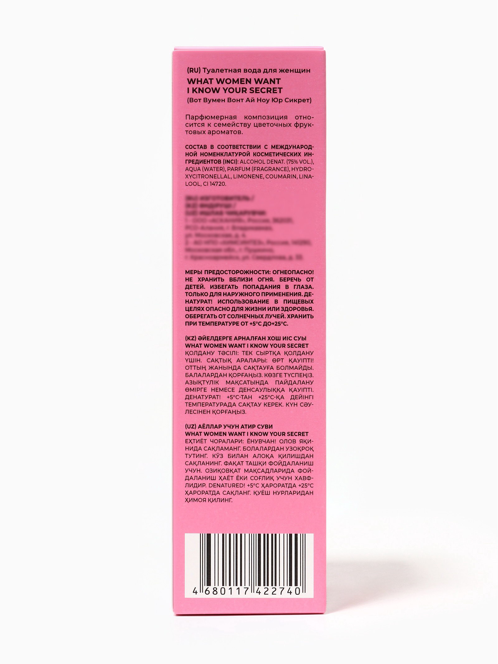 Базовые ноты: Древесные акценты, Дубовый мох, Мускус Группа ароматов: Фруктовые, Цветочные Верхние ноты: Ананас, Грейпфрут, Клубника, Маракуйя, Танжерин Средние ноты: Жасмин, Ландыш, Орхидея, Пион, Ягоды Размер упаковки: 4.5 x 4.5 x 17 см. tnved: 3303009000 Температурное ограничение: Нет Честный знак: Честный знак Вид: Туалетная вода Для кого: Для женщины Вид дозатора: Распылитель Женская туалетная вода What Women Want?I Know Your Secret объёмом 50?мл это аромат для женщин, которые любят сочетать игривость, женственность и уверенность в себе. Он относится к семейству цветочные фруктовые, объединяя свежие, сочные фруктовые акценты с нежными цветочными оттенками и тёплой, обволакивающей базой. Флакон объёмом 50?мл удобно носить с собой аромат всегда под рукой, чтобы освежить настроение и подчеркнуть индивидуальность в любой ситуации. I Know Your Secret подходит для повседневного использования, встреч с друзьями, прогулок, а также для лёгкого вечернего выхода. Аромат раскрывается многогранно: