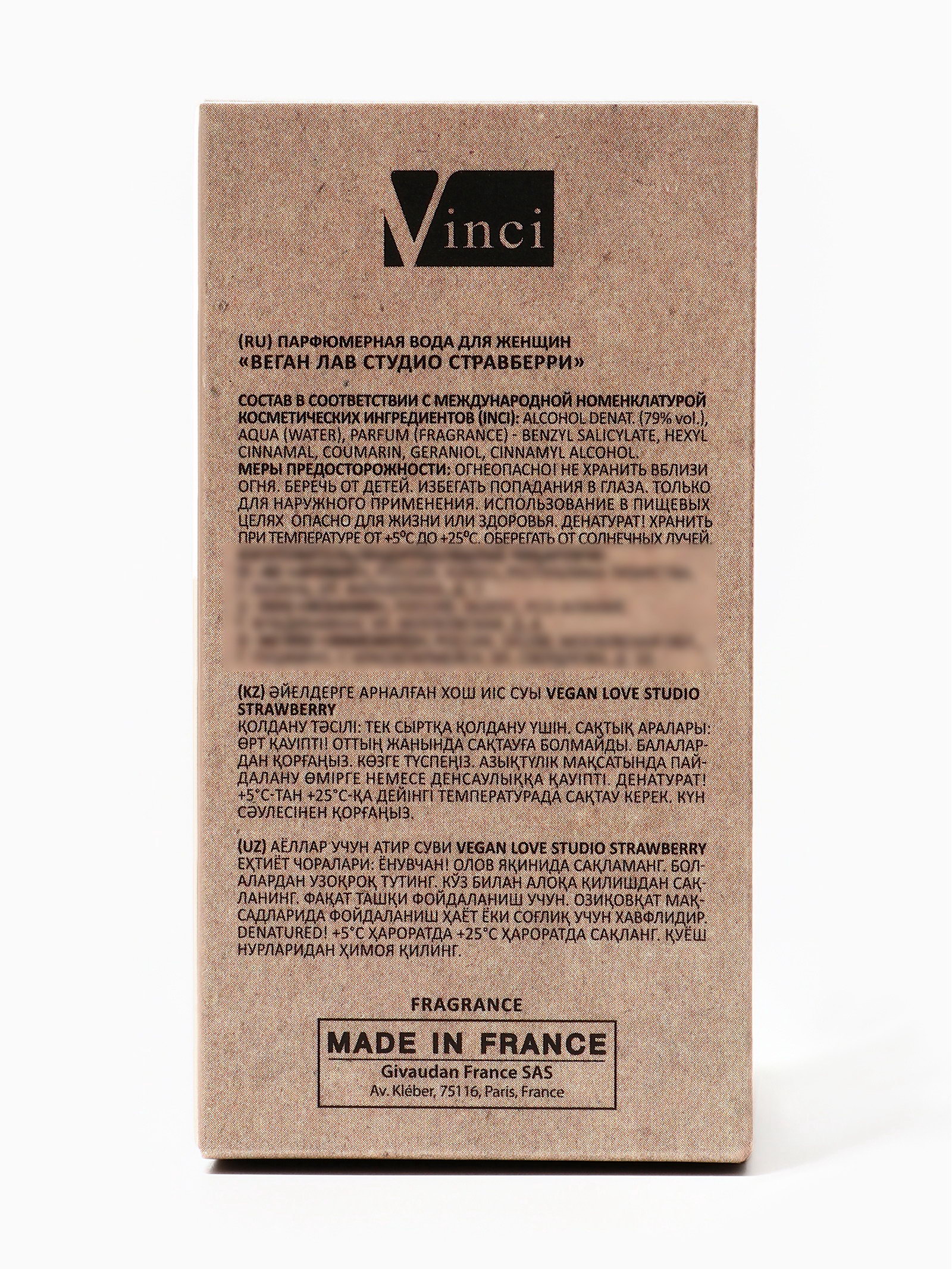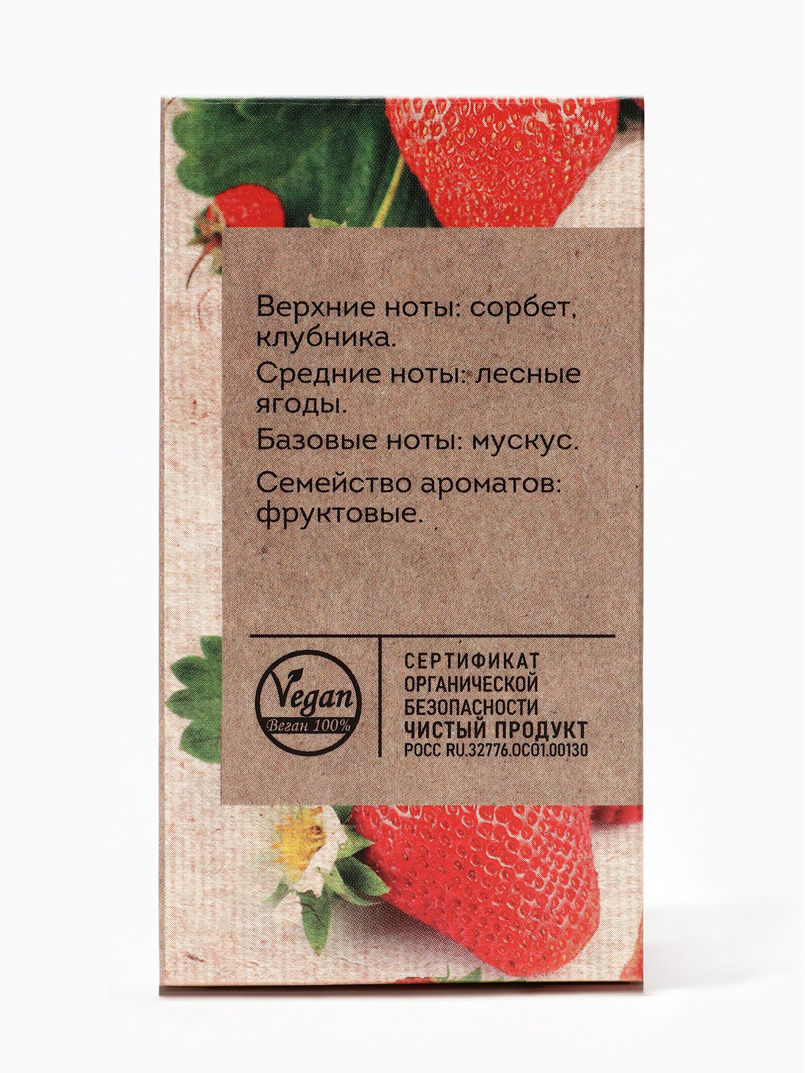 Верхние ноты: Клубника, Сорбет Размер упаковки: 5.5 x 5.5 x 10 см. tnved: 3307900000 Маркировка: Честный знак Температурное ограничение: Нет Группа ароматов: Фруктовые Для кого: Для женщины Средние ноты: Ягоды Базовые ноты: Мускус Вид дозатора: Распылитель Вид: Парфюмерная вода Парфюмерная вода женская Vegan Love Studio Strawberry, 50 мл Подарите себе яркое и игривое настроение с Vegan Love Studio Strawberry нежным и свежим средством для современной женщины, которая ценит легкость, сладкие акценты и фруктовую свежесть. Каждый флакон раскрывает гармоничное сочетание ягодных и мягких мускусных нот, создавая приятный и запоминающийся шлейф. Ноты композиции: