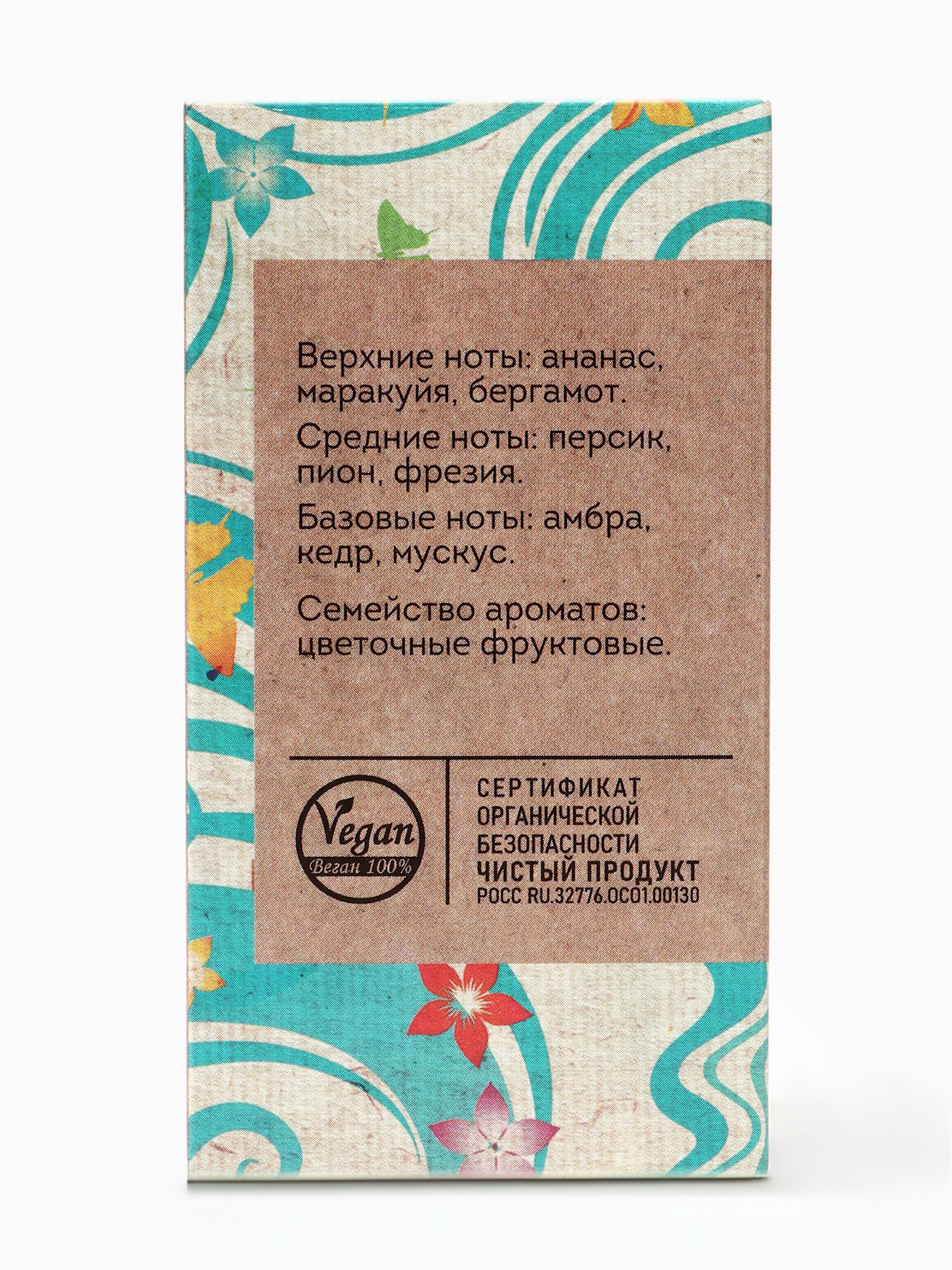Базовые ноты: Амбра, Кедр, Мускус Средние ноты: Персик, Пион, Фрезия Верхние ноты: Ананас, Бергамот, Маракуйя Группа ароматов: Фруктовые, Цветочные Размер упаковки: 5.5 x 5.5 x 10 см. tnved: 3307900000 Маркировка: Честный знак Температурное ограничение: Нет Вид: Парфюмерная вода Для кого: Для женщины Вид дозатора: Распылитель Парфюмерная вода женская Vegan Love Studio Sunshine, 50 мл Ощутите солнечное тепло и свежесть с Vegan Love Studio Sunshine идеальным средством для современной женщины, которая ценит яркость, энергию и лёгкость в каждом дне. Этот флакон наполнен сочной фруктово-цветочной композицией, создающей стойкий и притягательный шлейф. Ноты композиции: