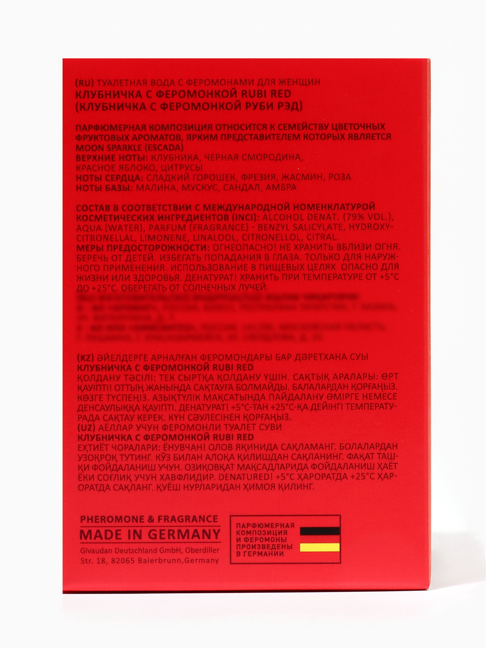 Для кого: Для женщины, Для неё Группа ароматов: Фруктовые, Цветочные Средние ноты: Жасмин, Роза, Сладкий горошек, Фрезия Базовые ноты: Амбра, Малина, Мускус, Сандал/Сантал Верхние ноты: Клубника, Смородина, Цитрусовые ноты, Яблоко Размер упаковки: 6.5 x 6.5 x 9 см. tnved: 3303009000 Честный знак: Да Температурное ограничение: Нет Вид: Туалетная вода Вид дозатора: Распылитель Клубничка с феромонкой Rubi Red это аромат для женщин, которые хотят подчеркнуть свою яркую, игривую и магнетическую привлекательность. Он создан для тех, кто ценит сладкую соблазнительность, жизнерадостность и способность привлекать внимание своей обаянием. Парфюм с феромонами словно невидимая сила, усиливающая притягательность и создающая ауру лёгкой интриги. С первых мгновений Rubi Red раскрывается насыщенными и сочными ягодными нотами, создавая ощущение свежести, радости и бодрости. В сердце аромата проявляются мягкие фруктовые и цветочные акценты, придающие композиции женственность, нежность и лёгкую игривую соблазнительность. Базовые ноты создают мягкий и манящий шлейф, подчёркивающий харизму и индивидуальность своей обладательницы. Клубничка с феромонкой Rubi Red идеально подходит для летних прогулок, встреч с друзьями и романтических свиданий, когда хочется быть яркой, обаятельной и притягательной. Аромат раскрывает внутреннюю энергию, мягкую женственность и лёгкую игривость, создавая образ уверенной, молодой и жизнерадостной женщины. Парфюм оставляет за собой сладкий, мягкий и манящий шлейф, который сопровождает на протяжении всего дня, создавая атмосферу игривости, радости и женской магнетической силы. Флакон: 50 мл компактный, стильный и удобный для ношения с собой, отражает концепцию аромата: сладость, игривость и женская привлекательность. | ||