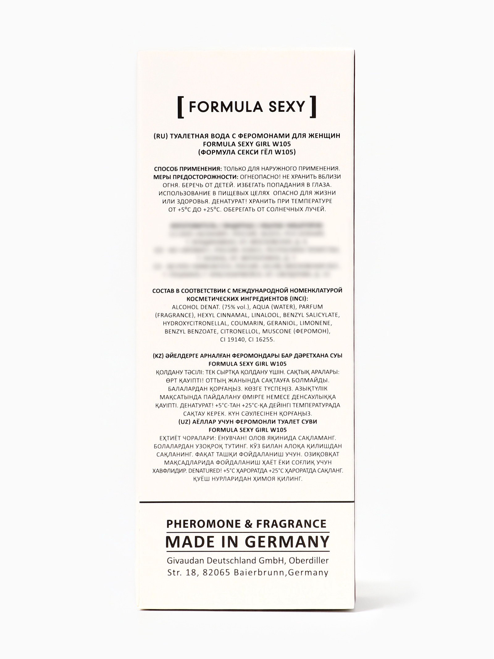 Для кого: Для женщины, Для неё Базовые ноты: Амбра, Бобы тонка, Ваниль, Искусственный мускус, Какао, Кашемировое дерево, Кедр, Корица, Пачули, Пралине, Сандал/Сантал Группа ароматов: Восточные, Цветочные Средние ноты: Апельсин, Жасмин, Ирис, Роза, Самбак, Тубероза Верхние ноты: Бергамот, Кофе, Лимон, Миндаль Размер упаковки: 4.5 x 3 x 12 см. tnved: 3303009000 Температурное ограничение: Нет Честный знак: Честный знак Вид: Туалетная вода Вид дозатора: Распылитель Formula Sexy Collection Girl W105 это аромат для женщин, которые хотят подчеркнуть свою молодость, игривость и магнетическую привлекательность. Он создан для тех, кто ценит лёгкость, свежесть и обаяние, создавая вокруг себя атмосферу игривой женственности и лёгкой интриги. Этот парфюм с феромонами словно невидимая энергия, усиливающая обаяние и создающая эффект притяжения. С первых мгновений Girl W105 раскрывается яркими и свежими нотами, создавая ощущение бодрости, радости и лёгкой игривости. В сердце аромата проявляются нежные цветочные и фруктовые акценты, придающие композиции женственность, мягкость и игривую привлекательность. Базовые ноты создают стойкий, тёплый и манящий шлейф, подчёркивающий харизму и индивидуальность своей обладательницы. Formula Sexy Collection Girl W105 идеально подходит для повседневного использования, прогулок, встреч с друзьями и активного отдыха, когда хочется быть яркой, обаятельной и притягательной. Аромат раскрывает внутреннюю энергию, женственность и лёгкую соблазнительность, создавая образ молодой, уверенной и харизматичной женщины. Парфюм оставляет за собой мягкий, свежий и манящий шлейф, который сопровождает на протяжении всего дня, создавая атмосферу радости, игривости и женской магнетической силы. Флакон: 30 мл компактный, стильный и удобный для ношения с собой, отражает концепцию аромата: лёгкость, игривость и женская притягательность. | ||
