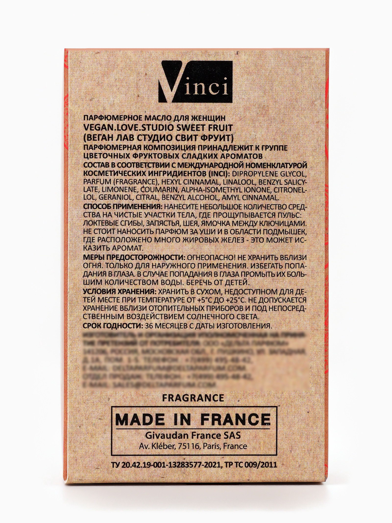 Группа ароматов: Фруктовые, Цветочные Базовые ноты: Древесные акценты, Ирис, Мускус Средние ноты: Белый шоколад, Орхидея, Пирожное Верхние ноты: Айва, Киви, Личи Размер упаковки: 3.5 x 9 x 5.5 см. tnved: 3307490000 Температурное ограничение: Нет Вид дозатора: Шариковый ролик Для кого: Для женщины Вид: Парфюмерное масло Парфюмерное масло VEGAN.Love.Studio Sweet Fruit это сладкий, игривый и чувственный аромат, созданный для уверенных, жизнерадостных женщин. По мотивам культового Fantasy (Britney Spears), масло сочетает сочные фруктовые акценты с нежными цветочными и сладкими базовыми нотами, создавая стойкий и запоминающийся шлейф. Аромат открывается сочной сладостью красных ягод, киви и сочного мандарина, которые мгновенно дарят радость и энергичное настроение. В сердце композиции звучат фрезия, орхидея и жасмин, придавая аромату женственность и утончённость. Базовые ноты ванили, белого мускуса и древесных акцентов создают тёплый, бархатистый шлейф, который остаётся на коже длительное время, усиливая соблазнительный эффект. Концентрированная формула парфюмерного масла обеспечивает долгую стойкость аромата и его постепенное раскрытие. Масло удобно наносить на точки пульса запястья, шею, за ушами чтобы аромат раскрывался персонально и мягко, создавая индивидуальный шлейф. Преимущества VEGAN.Love.Studio Sweet Fruit:
