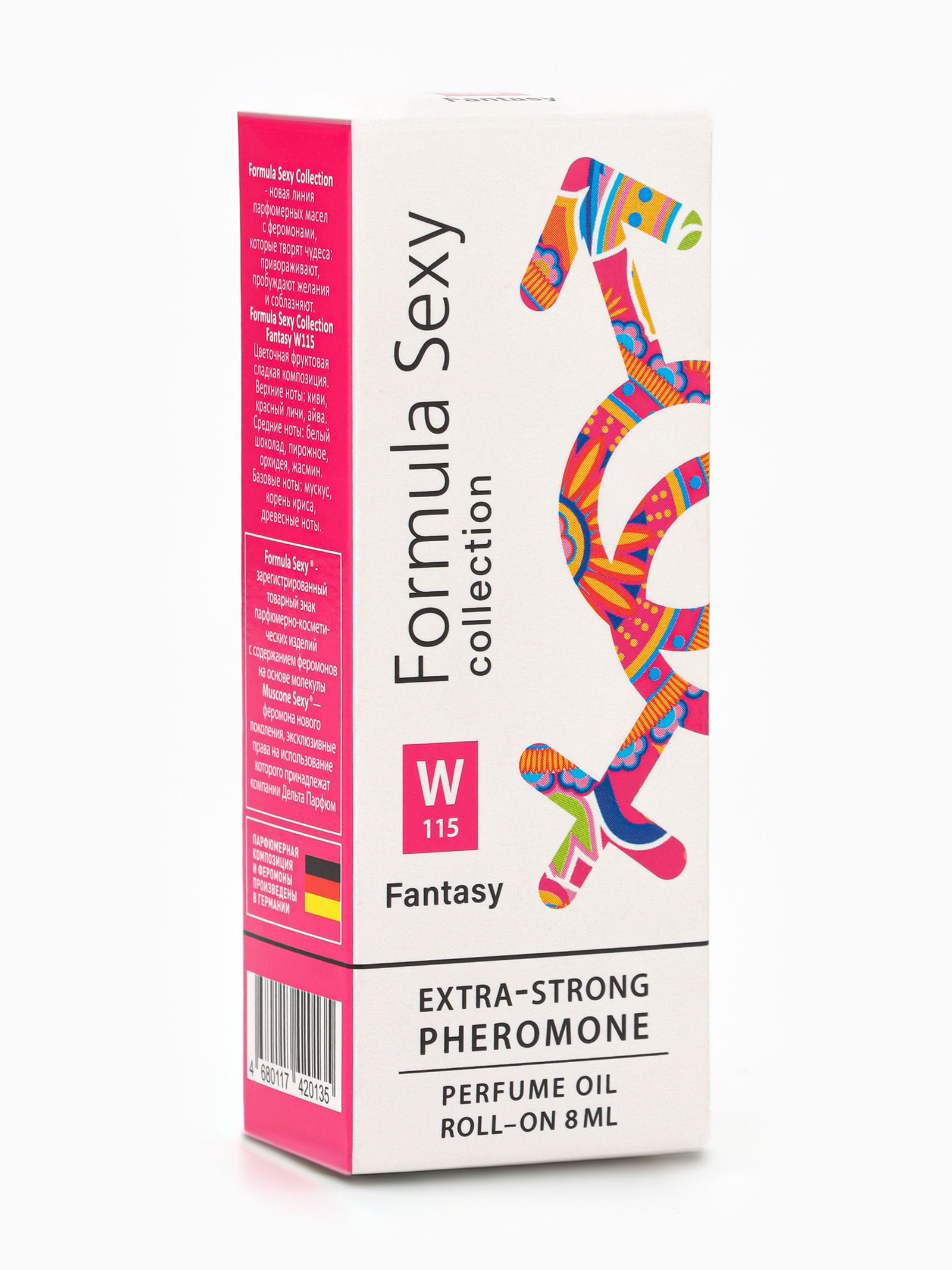 Группа ароматов: Фруктовые, Цветочные Базовые ноты: Древесные акценты, Ирис, Мускус Средние ноты: Белый шоколад, Жасмин, Орхидея, Пирожное Верхние ноты: Айва, Киви, Личи Размер упаковки: 3 x 9 x 4 см. tnved: 3307490000 Температурное ограничение: Нет Вид: Парфюмерное масло Для кого: Для женщины Вид дозатора: Шариковый ролик Парфюмерное масло Formula Sexy Collection Fantasy W115 это сказочный аромат, заключённый в компактный флакон на 8 мл, который дарит вашим эмоциям волшебство и чувственность. Вдохновлённый легендарным поп-хитом от Бритни Спирс, этот аромат переносит вас в мир сладкой мечты, романтики и легкой наивности всё это подчёркнуто феромонами, которые усиливают вашу женственность и очарование. Масляная база обеспечивает деликатное и стойкое раскрытие композиции: первые ноты фруктовый взрыв сладких ягод и сахарной ваты, далее нежные оттенки фиалки, орхидеи и мягкий ванильный шлейф. Благодаря масляной текстуре аромат остаётся на коже часами, постепенно раскрываясь и создавая пленительный, интимный шлейф. Феромоны придают аромату дополнительную магнетичность они усиливают притягательность и помогают вам чувствовать себя уверенно и соблазнительно в любой ситуации. Кому подойдёт