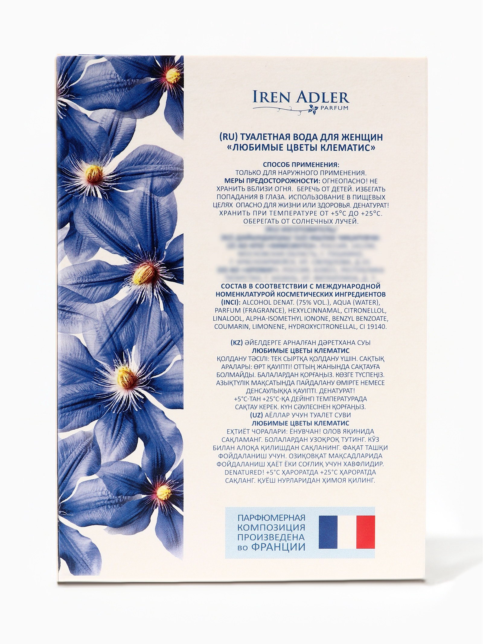 Группа ароматов: Зелёный, Цветочные Размер упаковки: 8.5 x 3.5 x 12.5 см. tnved: 3303009000 Температурное ограничение: Нет Честный знак: Честный знак Для кого: Для женщины Вид: Туалетная вода Вид дозатора: Распылитель Туалетная вода женская "Любимые Цветы Клемати", 100 мл это утончённый, нежный и элегантный аромат для женщин, которые ценят классику, женственность и гармонию. Вдохновлённый легендарным Climat (Lancome), он сочетает свежие зелёные и цветочные акценты с мягкой древесной базой, создавая стойкий, деликатный и притягательный шлейф. Композиция открывается свежими нотами зелёного чая, бергамота и нежной зелени, даря ощущение лёгкости, свежести и внутренней гармонии. В сердце аромата раскрываются цветочные ноты клематиса, жасмина и фрезии, придавая аромату утончённость, женственность и мягкую элегантность. Базовые ноты кедра, белого мускуса и лёгкой древесины формируют стойкий, бархатистый и чарующий шлейф, который остаётся на коже на протяжении всего дня. Туалетная вода подчёркивает индивидуальность, создаёт ощущение лёгкости и естественной привлекательности, идеально подходя как для повседневного использования, так и для особых случаев. Преимущества "Любимые Цветы Клемати", 100 мл:
