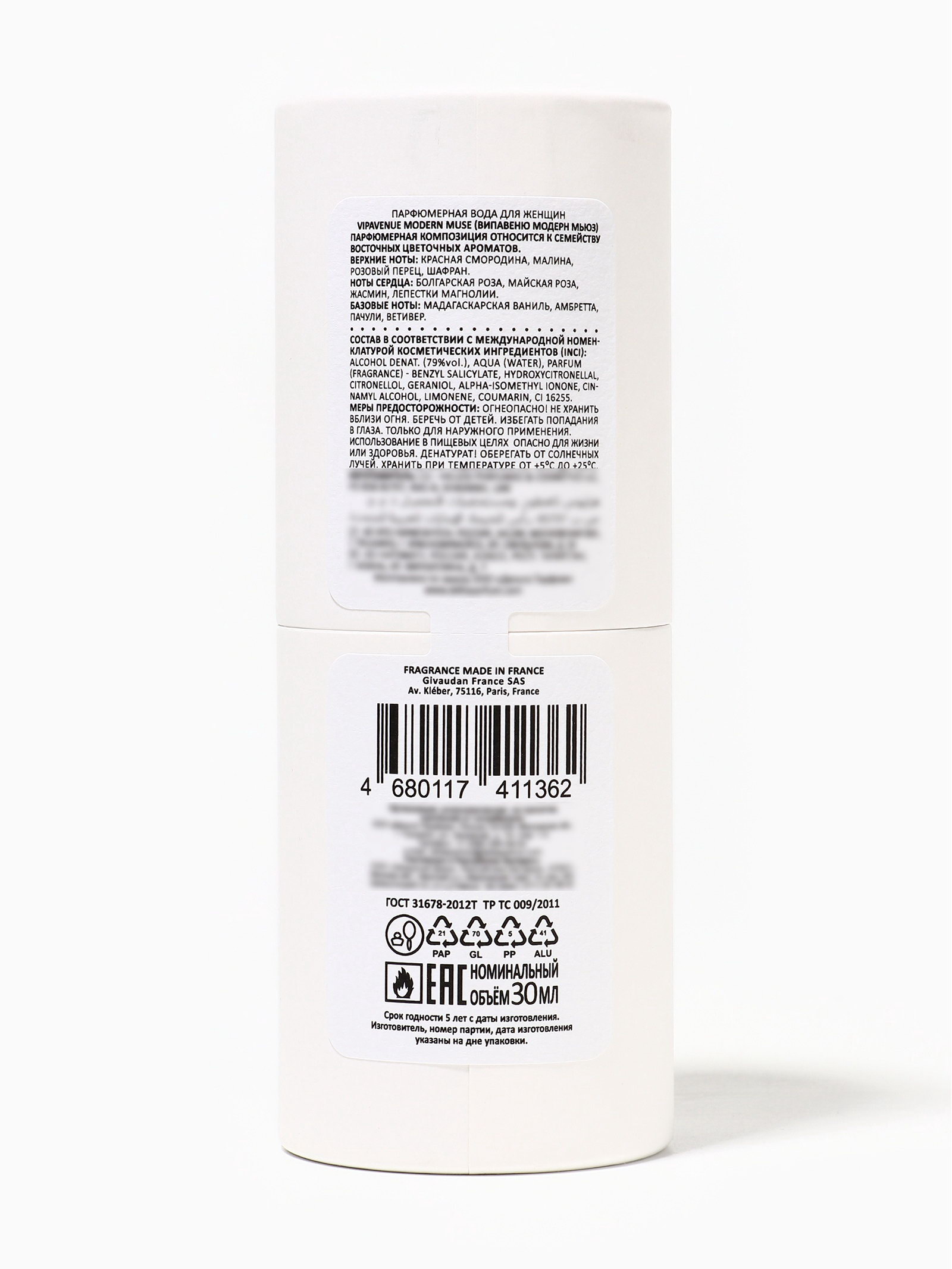 Группа ароматов: Восточные, Цветочные Базовые ноты: Амбретта, Ваниль, Ветивер, Пачули Верхние ноты: Малина, Перец, Смородина, Шафран Средние ноты: Жасмин, Магнолия, Роза Размер упаковки: 5 x 5 x 13.5 см. tnved: 3307900000 Температурное ограничение: Нет Честный знак: Честный знак Вид: Парфюмерная вода Для кого: Для женщины Вид дозатора: Распылитель Парфюмерная вода женская VIPAVENUE Modern Mus, 30 мл это страстный, элегантный и соблазнительный аромат для женщин, которые ценят уверенность, женственность и современную утонченность. Вдохновлённая Modern Muse Le Rouge (Est?e Lauder), она сочетает цветочные и фруктовые ноты с тёплой пряно-древесной базой, создавая стойкий, бархатистый и манящий шлейф. Композиция открывается яркими нотами мандарина, красной смородины и грушевого акцента, даря ощущение свежести, энергии и уверенности. В сердце аромата раскрываются ноты розы, жасмина и пиона, придавая аромату женственность, утончённость и мягкую страсть. Базовые ноты пачули, амбры и белого мускуса создают глубокий, бархатистый и стойкий шлейф, который остаётся на коже на протяжении всего дня. Парфюмерная вода VIPAVENUE Modern Mus подчёркивает природное обаяние и внутреннюю силу, создавая вокруг вас ощущение магнетизма и уверенности. Для максимального раскрытия наносите аромат на точки пульса запястья, шею, область за ушами так аромат проявит себя полностью, создавая персональный, страстный и чарующий шлейф. Преимущества VIPAVENUE Modern Mus, 30 мл: