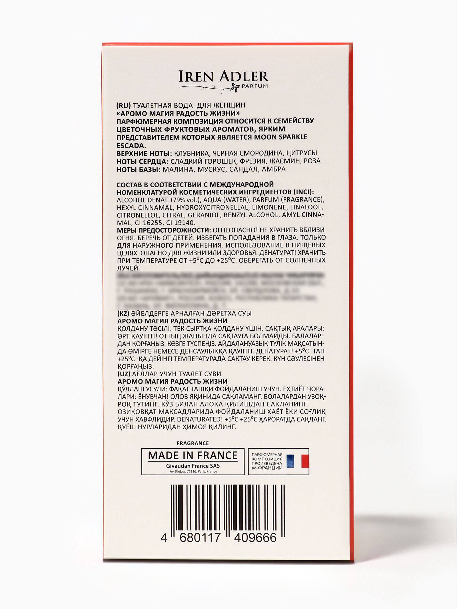 Группа ароматов: Фруктовые, Цветочные Базовые ноты: Амбра, Малина, Мускус, Сандал/Сантал Верхние ноты: Клубника, Смородина, Цитрусовые ноты Средние ноты: Жасмин, Роза, Сладкий горошек, Фрезия Размер упаковки: 5.5 x 4 x 11.5 см. tnved: 3303009000 Температурное ограничение: Нет Честный знак: Честный знак Вид: Туалетная вода Для кого: Для женщины Вид дозатора: Распылитель Туалетная вода женская Аромо Магия Радость Жизни, 30 мл это яркий, лёгкий и праздничный аромат для женщин, которые любят радость, свободу и позитивное настроение. Вдохновлённая композицией Moon Sparkle (Escada), эта туалетная вода сочетает сочные фруктовые акценты, воздушные цветочные ноты и мягкую сладкую базу, создавая игривый, сияющий и незабываемый шлейф. Композиция открывается яркими нотами спелого апельсина, личи и грейпфрута, которые дарят ощущение свежести, радости и бодрости. Это лёгкое и солнечное начало мгновенно поднимает настроение и создаёт атмосферу праздника. В сердце аромата раскрываются пионы, магнолия и фрезия, добавляя композиции нежности, романтичности и лёгкой цветочной воздушности. База построена на мягких акцентах мускуса и древесного амбрового шлейфа, которые делают аромат стойким, обволакивающим и тёплым. Он оставляет после себя лёгкий, сияющий след, который подчеркивает женственность и лёгкость характера. Для максимального эффекта наносите туалетную воду на точки пульса запястья, шею, область за ушами. Так аромат раскрывается полностью, создавая радостный, игривый и привлекательный шлейф. Преимущества Аромо Магия Радость Жизни, 30 мл: