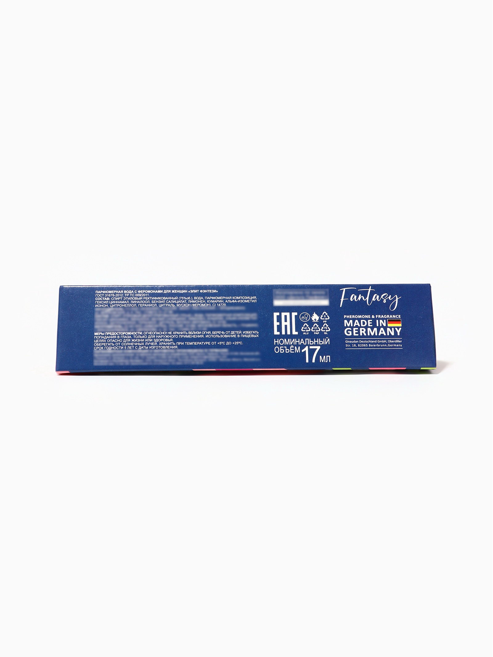 Средние ноты: Белый шоколад, Орхидея, Пирожное Группа ароматов: Фруктовые, Цветочные Верхние ноты: Айва, Киви, Личи Базовые ноты: Древесные акценты, Ирис, Мускус Размер упаковки: 4 x 4 x 15.5 см. tnved: 3307900000 Честный знак: Честный знак Температурное ограничение: Нет Вид: Парфюмерная вода Для кого: Для женщины Вид дозатора: Распылитель Парфюмерная вода женская Elite Fantasy с феромонами, 17 мл это сладкий, яркий и по-настоящему сказочный аромат для женщин, которые любят романтику, игривость и сияющую женственность. Вдохновлённая легендарным Fantasy (Britney Spears), эта композиция сочетает сочные фруктовые акценты, цветочно-кондитерское сердце и мягкую мускусно-древесную базу, создавая сладкий, волшебный и притягательный шлейф. Аромат открывается искрящимися нотами киви, личи и айвы, которые мгновенно дарят ощущение свежести, игривости и лёгкого флирта. Эти яркие акценты создают настроение беззаботности и сладкого удовольствия. В сердце аромата раскрывается фирменная "кондитерская" нота кекс, дополненный белой орхидеей и жасмином. Это нежное, сладкое и обволакивающее сочетание делает аромат особенно женственным, манящим и уютным. Базовые ноты мускуса, ириса и древесного аккорда создают мягкий, сливочный и стойкий шлейф, который остаётся на коже в течение всего дня, делая аромат тёплым и по-настоящему магнетичным. Феромоны усиливают индивидуальность композиции, подчёркивают природную притягательность и создают вокруг обладательницы особую ауру очарования. Для максимального раскрытия наносите парфюм на точки пульса запястья, шею, область за ушами. Так аромат будет звучать ярче, насыщеннее и дольше. Преимущества Elite Fantasy, 17 мл: