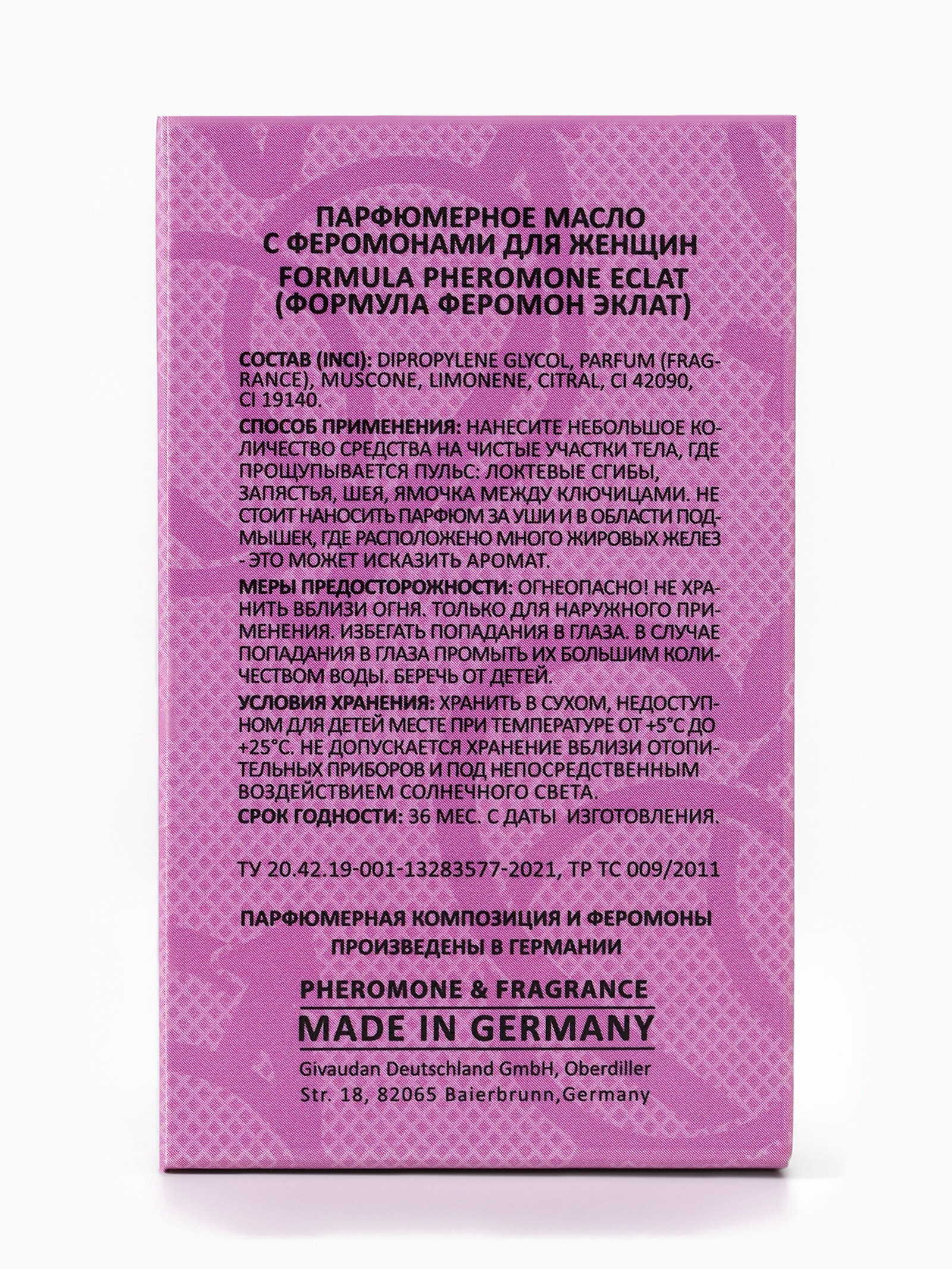 Группа ароматов: Зелёный, Цветочные Базовые ноты: Амбра, Кедр, Мускус Верхние ноты: Зелёная сирень, Петитгрейн Средние ноты: Вистерия, Зелёный чай, Османтус, Персик, Пион Размер упаковки: 3.5 x 9 x 5.5 см. tnved: 3307490000 Температурное ограничение: Нет Вид дозатора: Шариковый ролик Для кого: Для женщины Вид: Парфюмерное масло Парфюмерное масло Formula Pheromone Eclat это утончённый, свежий и элегантный аромат с феромонами, созданный для женщин, которые хотят подчеркнуть свою женственность, обаяние и харизму. По мотивам знаменитого ?clat d’Arp?ge (Lanvin), масло сочетает нежные цветочные ноты с лёгкой фруктовой свежестью, создавая стойкий и гармоничный шлейф. Аромат раскрывается верхними нотами зелёного мандарина, лимона и груши, даря свежесть и лёгкость. В сердце композиции звучат цветочные акценты пиона, жасмина и фрезии, добавляя утончённость и мягкую женственность. Базовые ноты кедра, белого мускуса и лёгкой амбры закрепляют аромат, создавая тёплый, стойкий и элегантный шлейф, который остаётся на коже на протяжении всего дня. Формула с феромонами усиливает естественную привлекательность и создаёт невидимое притяжение, делая образ более чарующим. Концентрированное парфюмерное масло обеспечивает длительное раскрытие аромата. Наносите масло на точки пульса запястья, шею, за ушами чтобы аромат раскрывался постепенно, создавая персональный и интригующий шлейф. Преимущества Formula Pheromone Eclat: