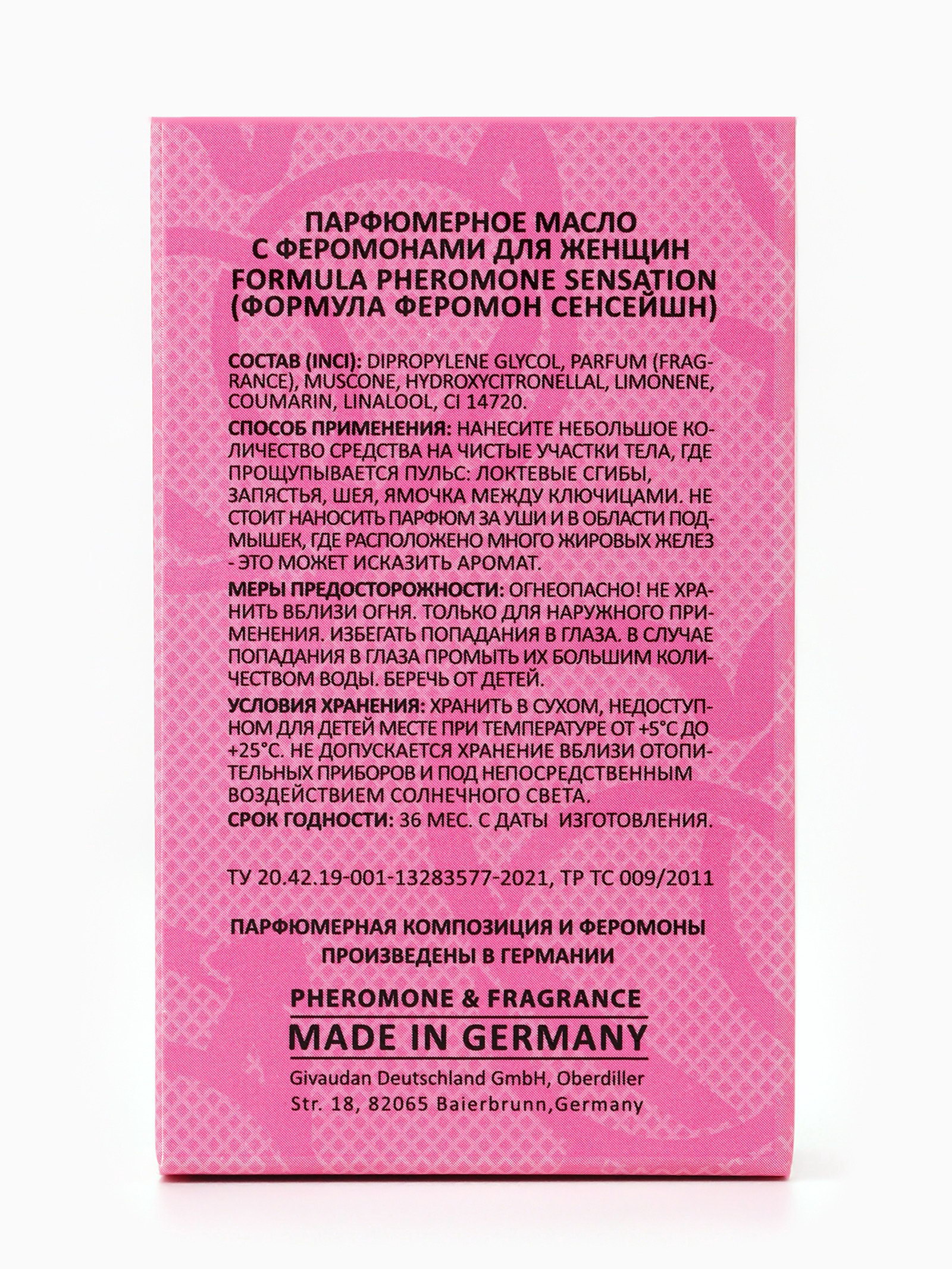 Верхние ноты: Ананас, Грейпфрут, Клубника, Маракуйя, Танжерин Средние ноты: Жасмин, Ландыш, Орхидея, Пион, Ягоды Базовые ноты: Древесные акценты, Дубовый мох, Мускус Группа ароматов: Фруктовые, Цветочные Размер упаковки: 3.5 x 9 x 5.5 см. tnved: 3307490000 Температурное ограничение: Нет Вид дозатора: Шариковый ролик Для кого: Для женщины Вид: Парфюмерное масло Парфюмерное масло Formula Pheromone Sensation это яркий, соблазнительный и притягательный аромат с феромонами, созданный для уверенных, женственных и харизматичных женщин. По мотивам культового Bombshell (Victoria's Secret), масло сочетает сочные фруктовые акценты с нежными цветочными нотами и сладкой базой, создавая стойкий, чувственный и запоминающийся шлейф. Аромат открывается яркими и сочными нотами грейпфрута, ягод и манго, даря бодрость, свежесть и энергичное настроение. В сердце композиции звучат пионы, орхидеи и фрезия, добавляя мягкость, женственность и утончённость. Базовые ноты мускуса, ванили и древесных акцентов закрепляют аромат, создавая тёплый, бархатистый и долгий шлейф, который остаётся на коже надолго. Формула с феромонами усиливает природное обаяние и магнетизм, создавая вокруг вас невидимое притяжение. Концентрированное масло обеспечивает постепенное раскрытие аромата и длительную стойкость. Наносите масло на точки пульса запястья, шею, за ушами чтобы аромат раскрывался индивидуально, создавая персональный шлейф. Преимущества Formula Pheromone Sensation: