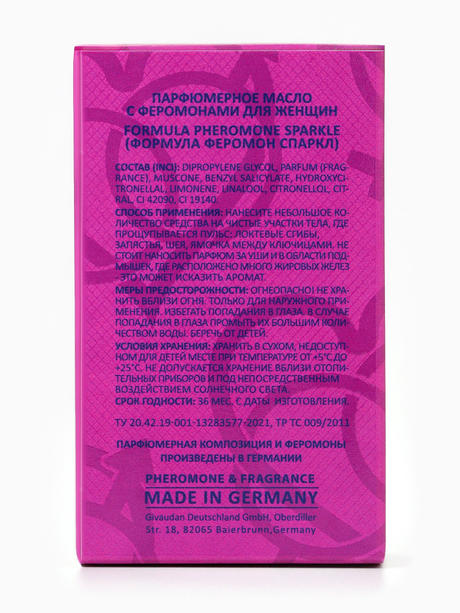 Базовые ноты: Амбра, Малина, Мускус, Сандал/Сантал Верхние ноты: Клубника, Смородина, Цитрусовые ноты, Яблоко Средние ноты: Жасмин, Роза, Сладкий горошек, Фрезия Группа ароматов: Фруктовые, Цветочные Размер упаковки: 3.5 x 9 x 5.5 см. tnved: 3307490000 Температурное ограничение: Нет Вид дозатора: Шариковый ролик Для кого: Для женщины Вид: Парфюмерное масло Парфюмерное масло Formula Pheromone Sparkle это яркий, свежий и игривый аромат с феромонами, созданный для женщин, которые хотят подчеркнуть свою женственность, обаяние и привлекательность. По мотивам Moon Sparkle (Escada), масло сочетает сочные фруктовые акценты с лёгкими цветочными нотами, создавая стойкий, весёлый и притягательный шлейф. Аромат раскрывается яркими верхними нотами красных ягод, мандарина и грейпфрута, даря ощущение радости, свежести и энергии. В сердце композиции звучат пионы, жасмин и фрезия, добавляя мягкость, элегантность и женственность. Базовые ноты мускуса и лёгкой древесины закрепляют аромат, создавая стойкий, бархатистый и чарующий шлейф, который остаётся на коже длительное время. Формула с феромонами усиливает естественную привлекательность и создаёт невидимое притяжение, делая образ более соблазнительным и магнетическим. Концентрированное масло обеспечивает постепенное раскрытие аромата и долговечность. Наносите масло на точки пульса запястья, шею, за ушами чтобы аромат раскрывался индивидуально, создавая персональный шлейф. Преимущества Formula Pheromone Sparkle: