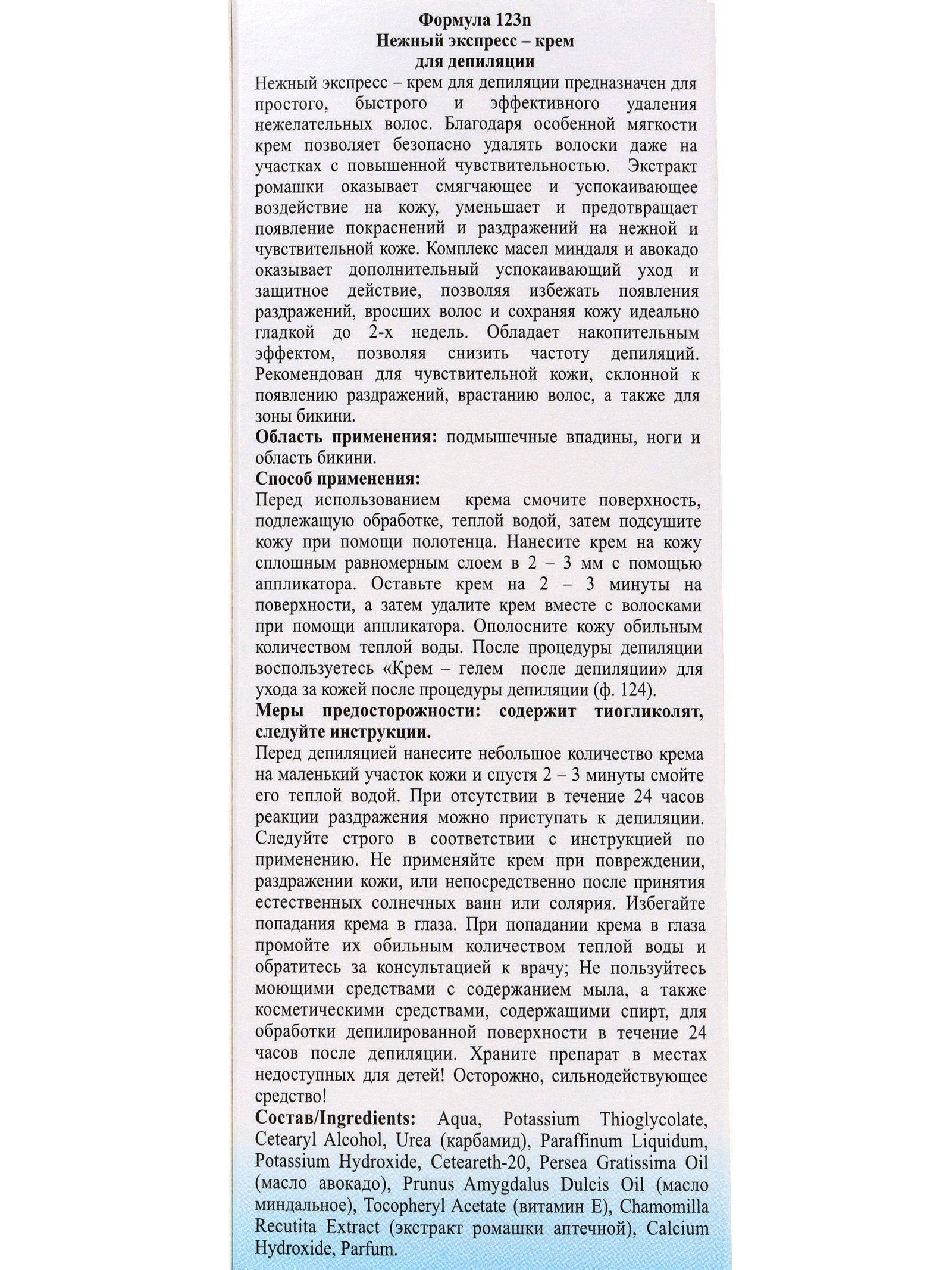 Размер упаковки: 6 x 3.5 x 18 см. Вид: Крем tnved: 3307900000 tnved: 3307900000 Нежный экспресс – крем для депиляции предназначен для простого, быстрого и эффективного удаления нежелательных волос. Включенный в состав крема лечебный экстракт ромашки оказывает смягчающее и успокаивающее воздействие на кожу, уменьшает и предотвращает появление покраснений и раздражений на нежной и чувствительной коже. Меры предосторожности: Перед депиляцией нанесите небольшое количество крема на маленький участок кожи и спустя 2 – 3 минуты смойте его теплой водой. При отсутствии в течение 24 часов реакции раздражения можно приступать к депиляции. Следуйте строго в соответствии с инструкцией по применению. Не применяйте крем при повреждении, раздражении кожи, или непосредственно после принятия естественных солнечных ванн или солярия. Избегайте попадания крема в глаза. При попадании крема в глаза промойте их обильным количеством теплой воды и обратитесь за консультацией к врачу; Не пользуйтесь моющими средствами с содержанием мыла, а также косметическими средствами, содержащими спирт, для обработки депилированной поверхности в течение 24 часов после депиляции. Храните препарат в местах недоступных для детей! Осторожно, сильнодействующее средство! Способ применения: Перед использованием крема смочите поверхность, подлежащую обработке, теплой водой, затем подсушите кожу при помощи полотенца. Нанесите крем на кожу сплошным равномерным слоем в 2 – 3 мм с помощью аппликатора. Оставьте крем на 2 – 3 минуты на поверхности, а затем удалите крем вместе с волосками при помощи аппликатора. Ополосните кожу обильным количеством теплой воды. Состав: Aqua, Potassium thioglycolate, Cetearyl Alcohol, Urea (Карбамид), Paraffinum Liquidum, Potassium Hydroxide, Ceteareth-20, Persea Gratissima Oil (Масло авокадо), Prunus Amygdalus Dulcis Oil (Масло миндальное), Tocopheryl Acetate (Витамин Е), Chamomilla Recutita Extract (Экстракт ромашки аптечная), Calсium Hydroxide, Parfum. | ||